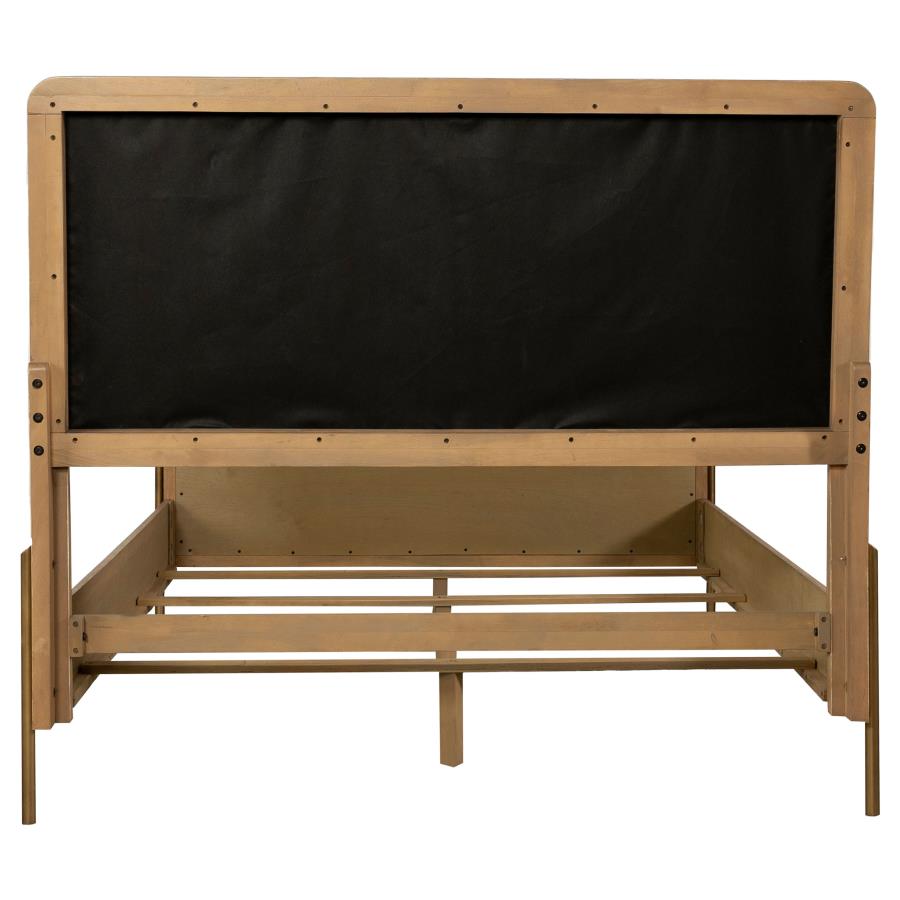 Elevate your retreat with this mid-century modern panel bed, designed with a textured wire-brushed sand wash finish across its grey fabric upholstered headboard and footboard. Aged brass metal legs lend a metallic accent that lends a glamorous touch.