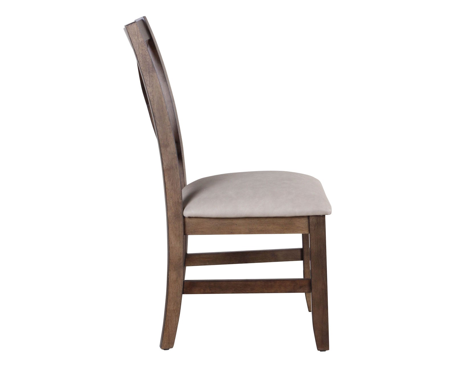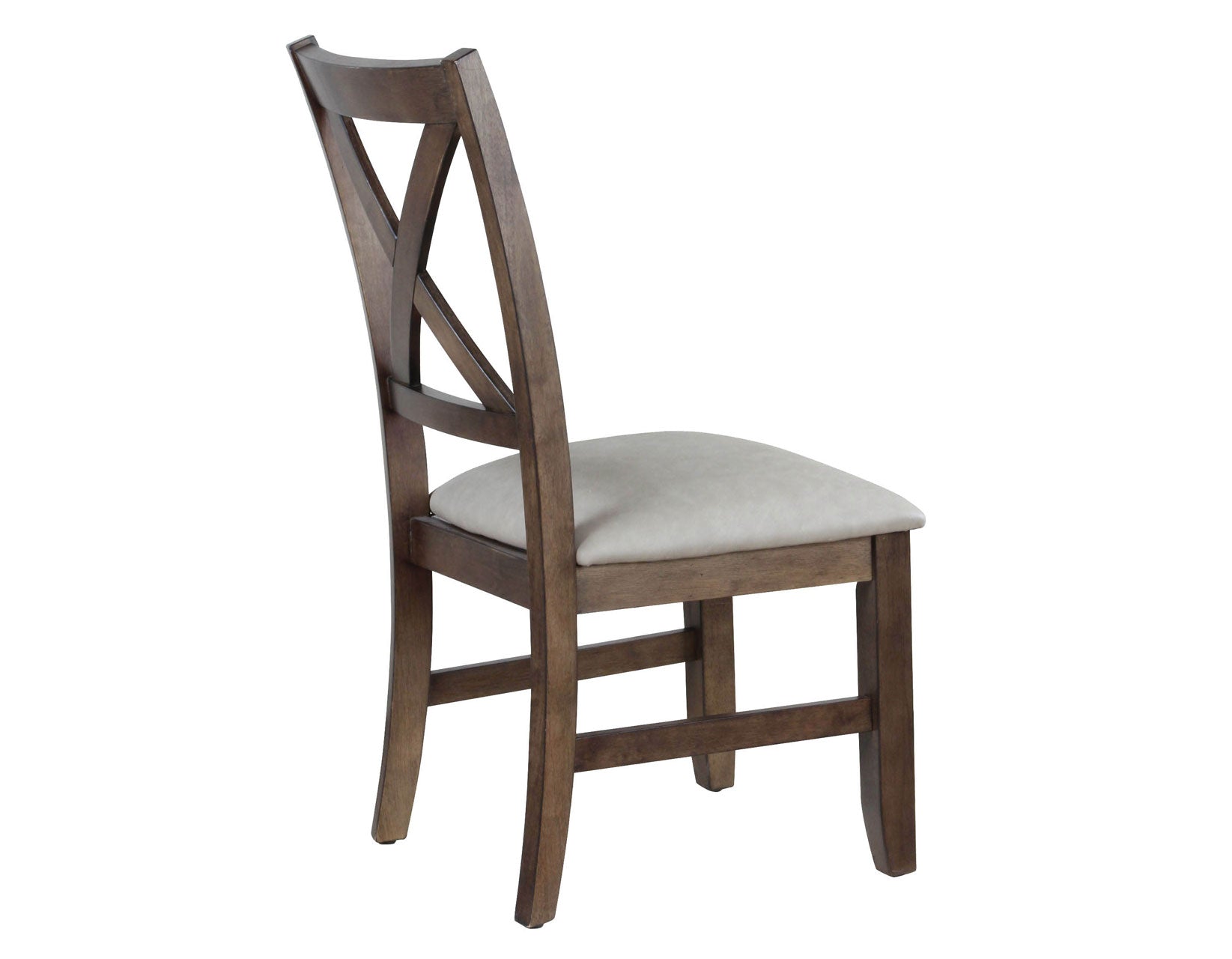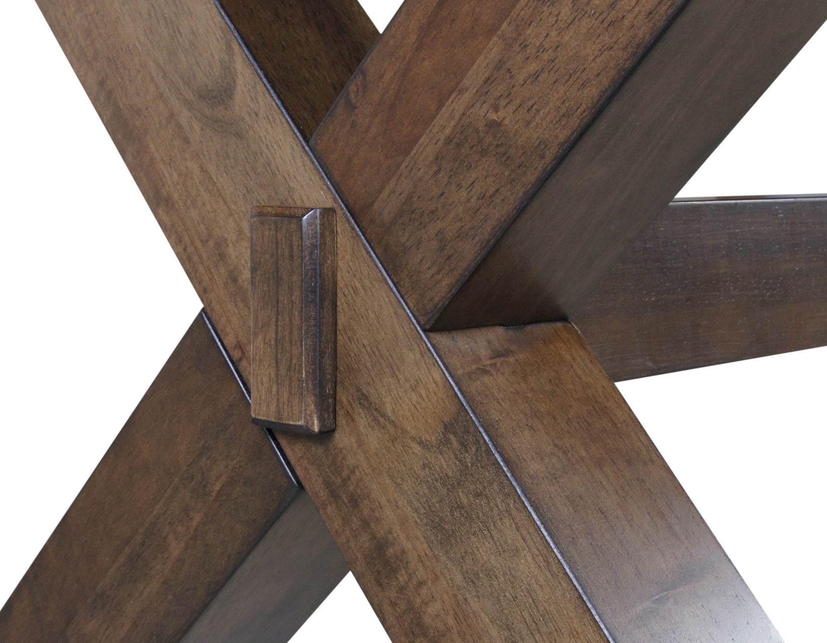 The rustic charm of Astoria is evident in this 5-piece dining set. Casual and warm, the table is constructed of sturdy wood solids and veneers finished with a warm mocha color that evokes the feel of a cozy mountain lodge. The hefty trestle table base features exposed tenons and and a crossed timber beam look for a casual, comfortable feel. The 62-inch table extends to 80 inches with the included 18-inch leaf to seat six comfortably with the upholstered seat side chair which features a Criss-cross shaped back silhouette.