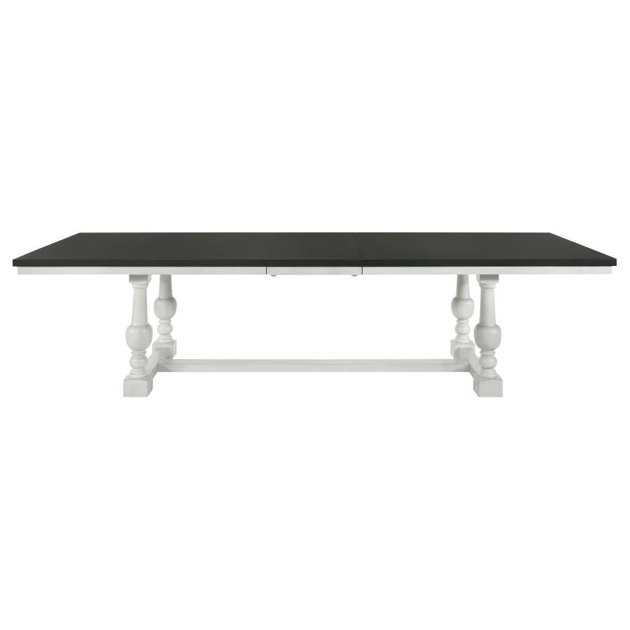 * Deep charcoal finish on the tabletop adds contrast and dimension to a modern seven-piece dining set * Vintage chalk white finish imparts compelling character with an understated weathered or aged look * Table features turned legs and a trestle detail for a casual touch of classic elegance * Chairs feature tight ladder backs with a plush padded seat, gray fabric upholstery, and turned legs * Rectangular table includes an extension leaf perfect for entertaining friends and family |