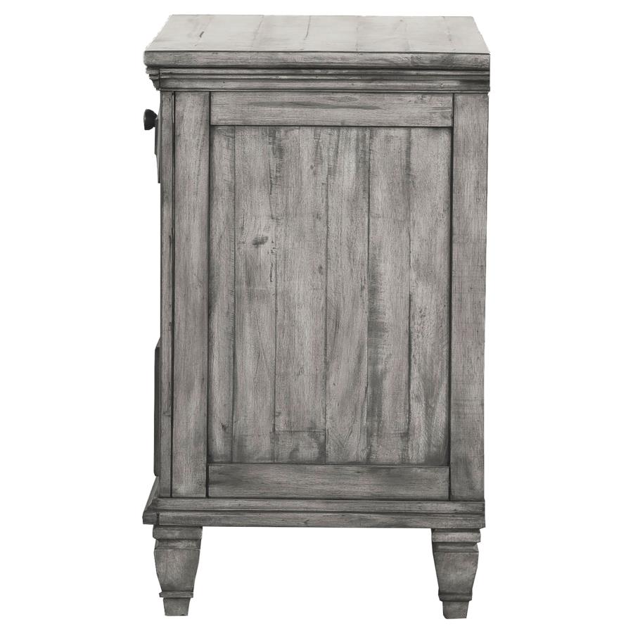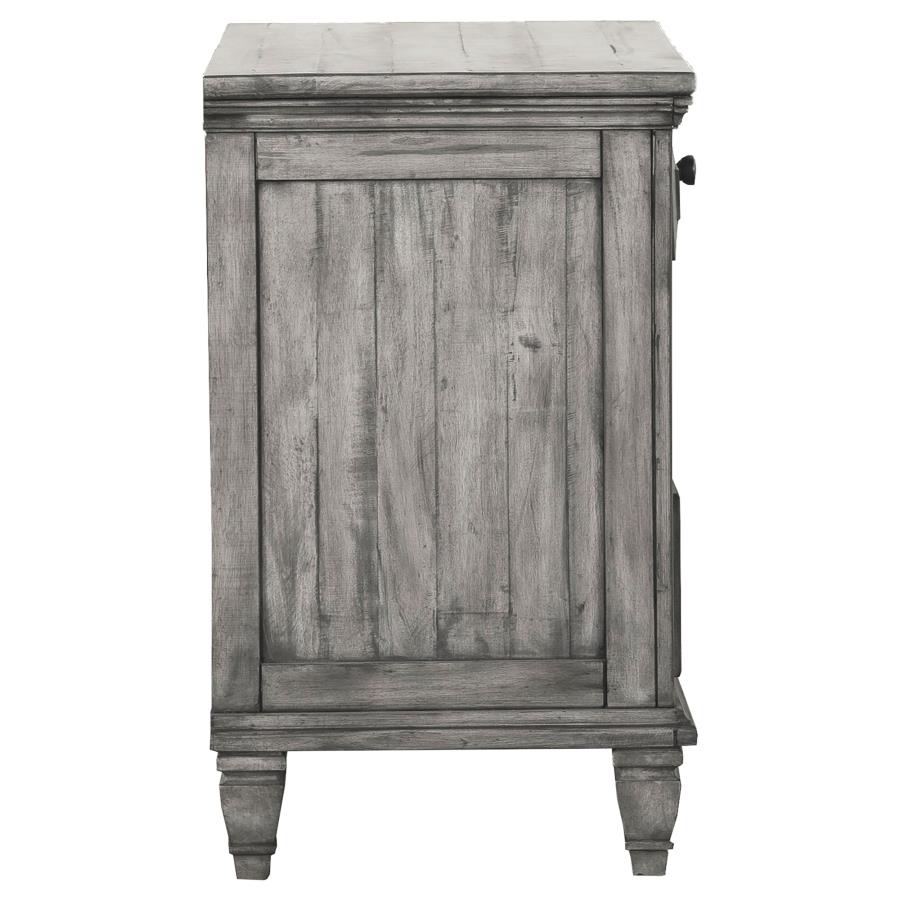 With a country flair and rustic elements, this charming traditional three-drawer nightstand offers classical design features such as crown molding, wood paneling, and a plank style design that gives your bedroom a farmhouse feel. A durable mahogany wood frame in a grey finish lends itself to your rustic styled bedroom with elegance and ease. Modernized for today, this three-drawer grey nightstand also features two cedar-lined bottom drawers, a black felt-lined top drawer, and a built-in USB charging port to add the finishing touches.