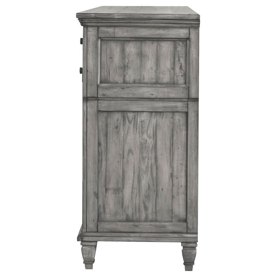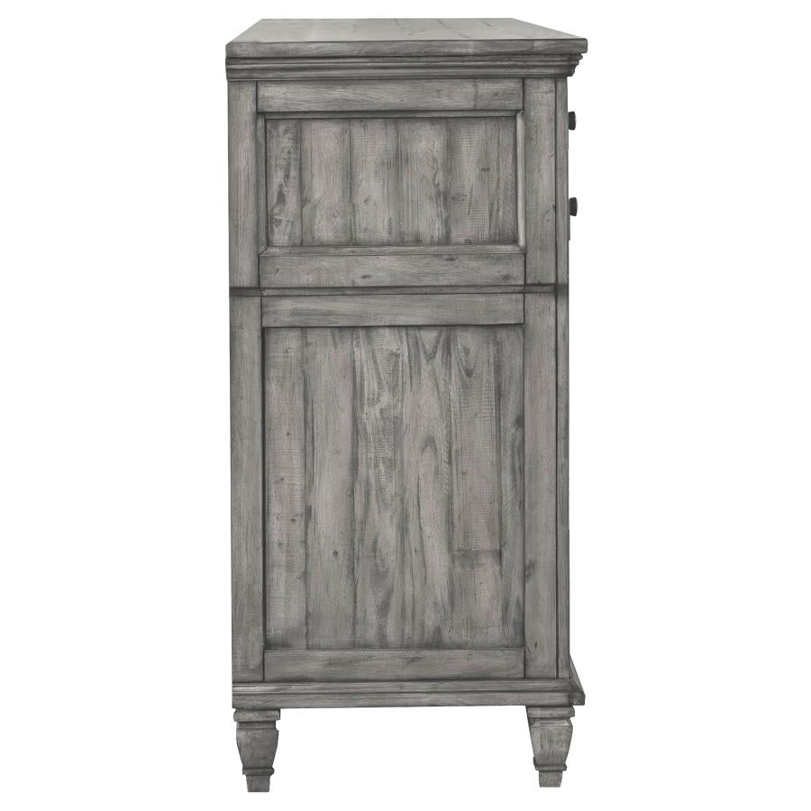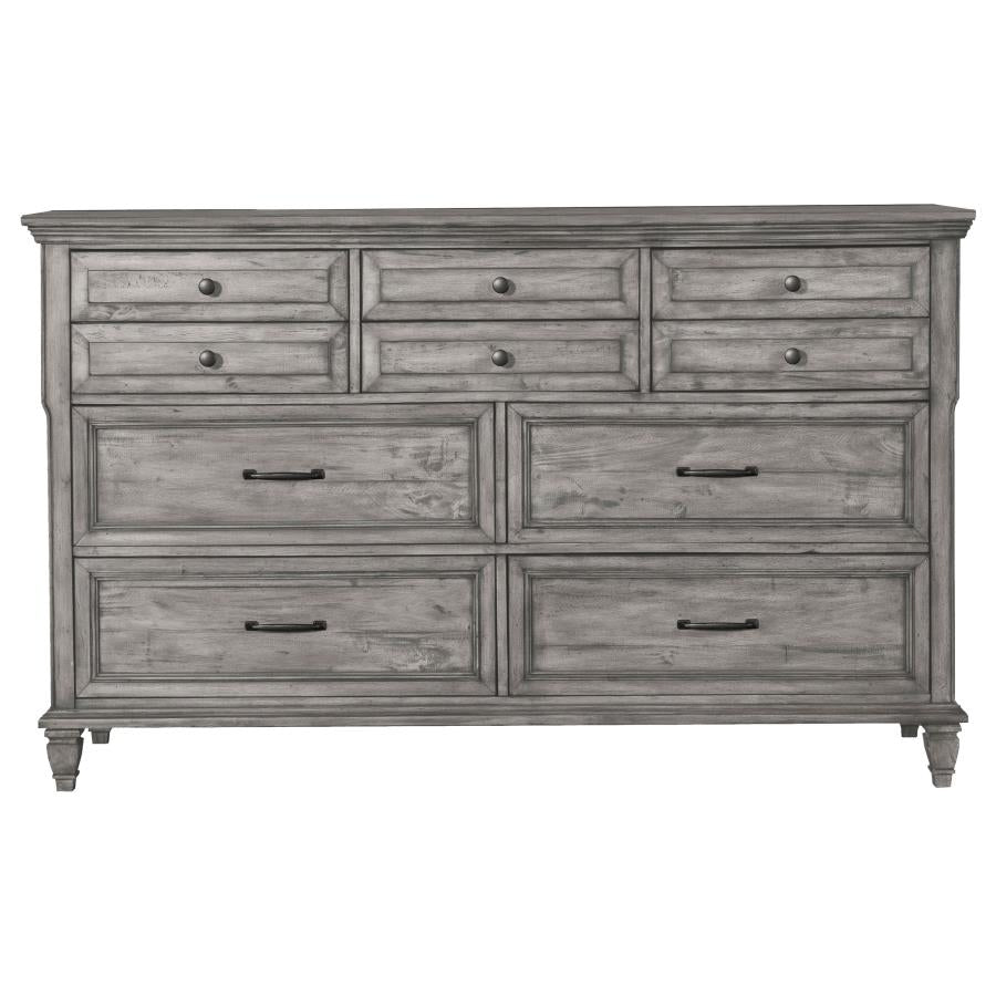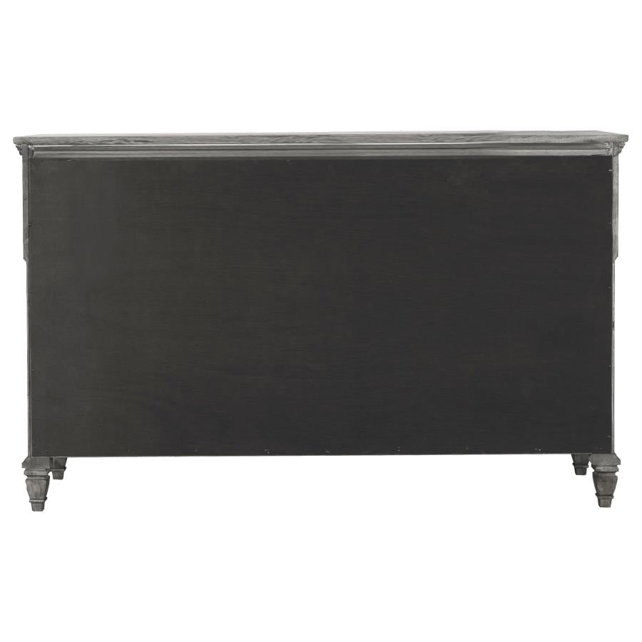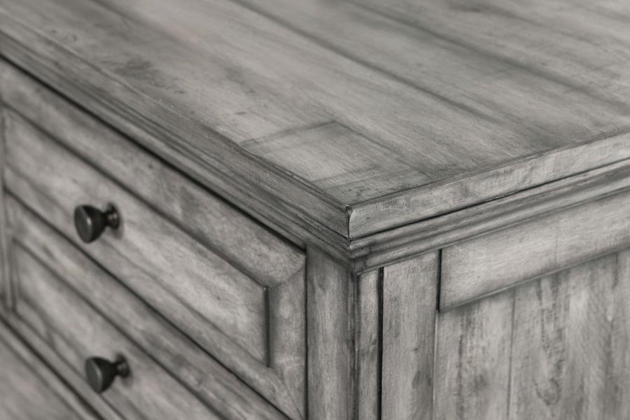 Create a formal rustic feel with this traditional grey dresser, built with thoughtful touches like soft felt-lined top drawers and cedar bottom drawers, adorned with metal pulls and handles. A neutral grey finished mahogany wood frame presents a charming casual look and slightly weathered appearance, enhanced by the intricate details of classic crown molding, wood trim, and carved legs.