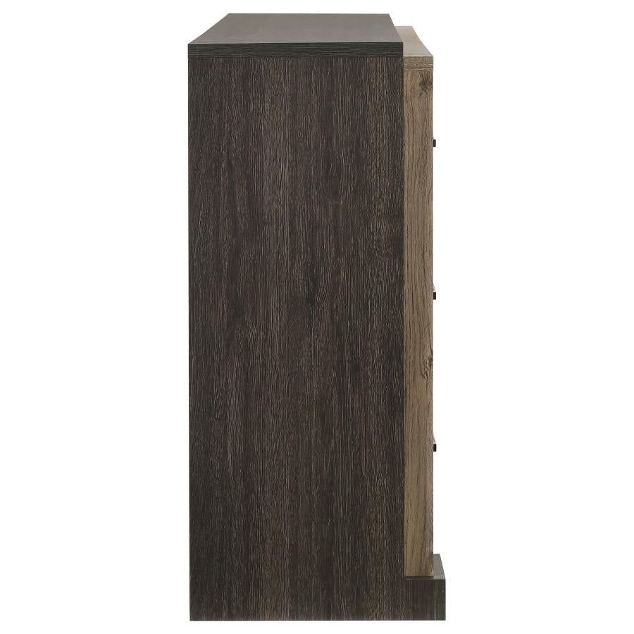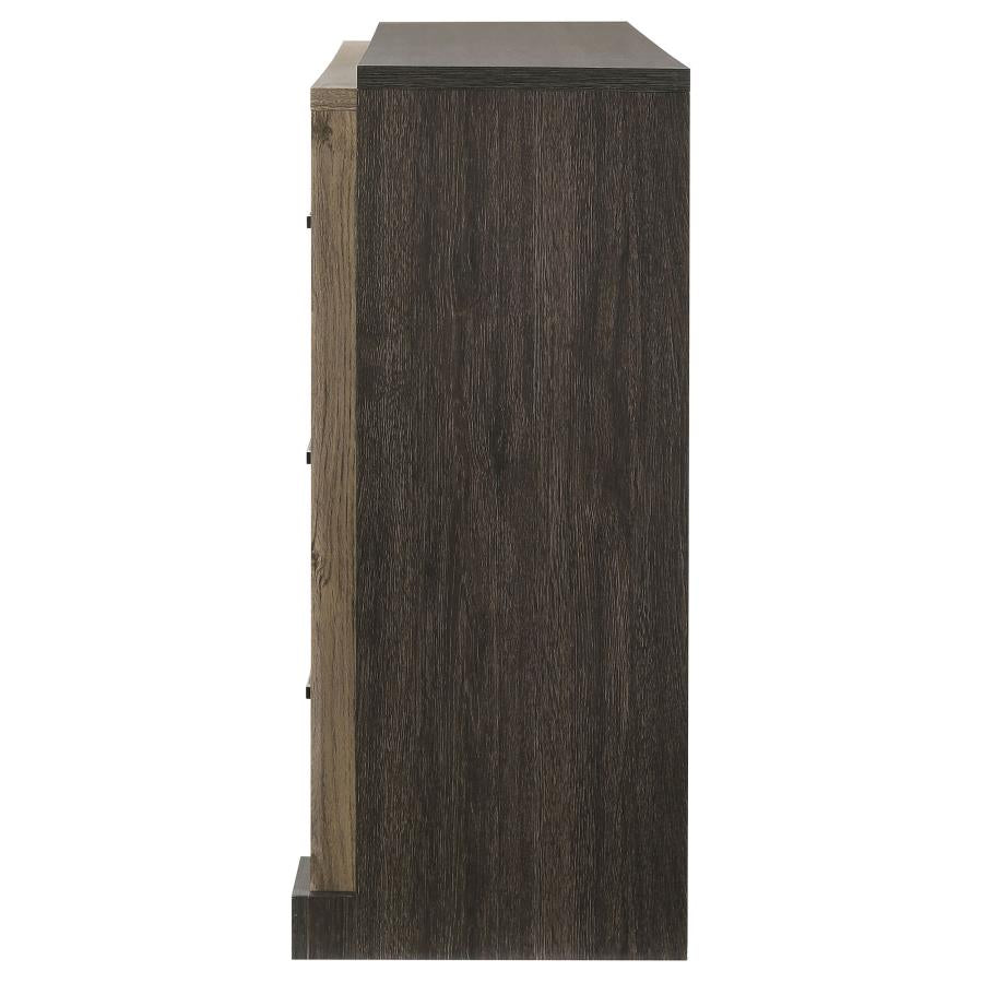 Give your bedroom a rustic charm with this contemporary dresser. The long, narrow frame offers six spacious drawers, the top two with a brown felt-lined interior that offers a soft place to store fine jewelry and silk garments. Slender matte bronze pulls on the front give a bold horizontal accent, mirroring the etched outer edge around the set of drawers. A brown outer casing allows the textural light taupe drawer fronts to be showcased. Along the bottom, bracket legs offer a slight lift to reveal decorative rugs and create definition against flooring.