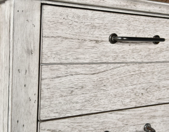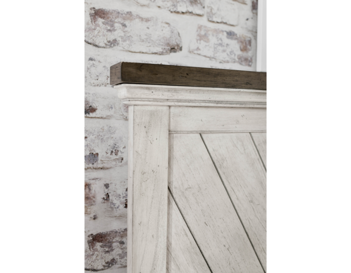 A rustic, farmhouse-inspired bedroom, Bear Creek features a white-smoke finish that contrasts beautifully with honey-smoke stained tops and cap rails. The chevron patterned headboard and footboard is offered in King and Queen sizes and the bedroom collection offers a variety of storage items with ultra-deep drawers supported by side drawer glides for easy operation.