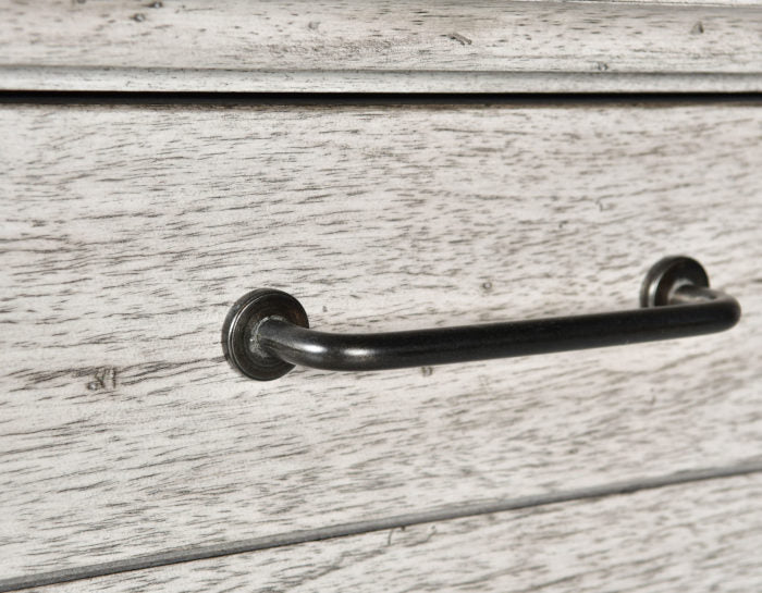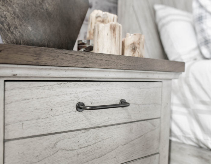 A rustic, farmhouse-inspired bedroom, Bear Creek features a white-smoke finish that contrasts beautifully with honey-smoke stained tops and cap rails. The chevron patterned headboard and footboard is offered in King and Queen sizes and the bedroom collection offers a variety of storage items with ultra-deep drawers supported by side drawer glides for easy operation.