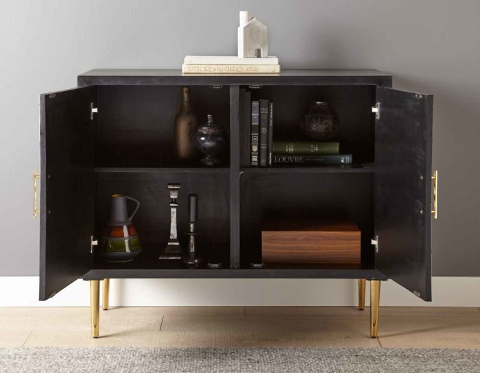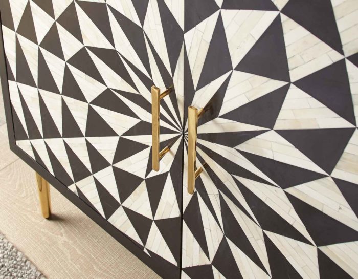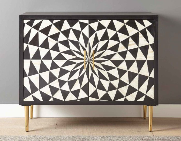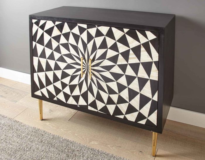 Modern elegance with an Art Deco design, Benzara represents a timeless style in a functional Accent Cabinet. This piece is sure to become the centerpiece of any room with its kaleidoscope of black and white bone and resin shards that adorn the front doors. Brass tapered legs and modern hardware warm the piece and enhance the feel of old Hollywood glamour. Two adjustable shelves provide storage for sweaters, clothing or even electronics to provide the ultimate in functionality and style.
