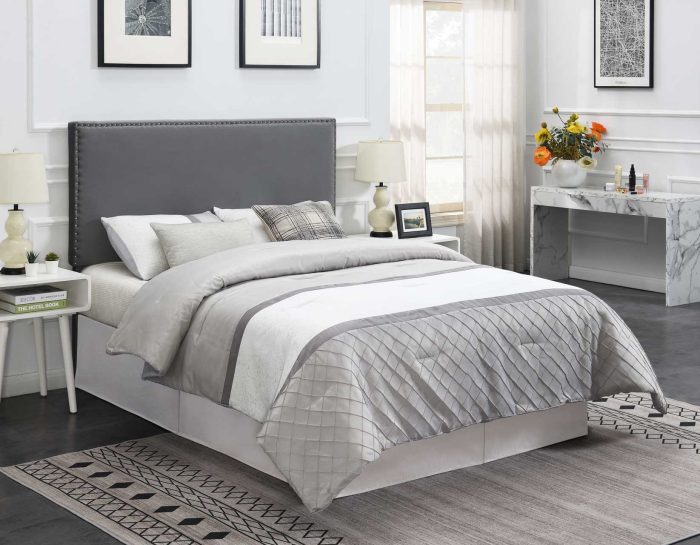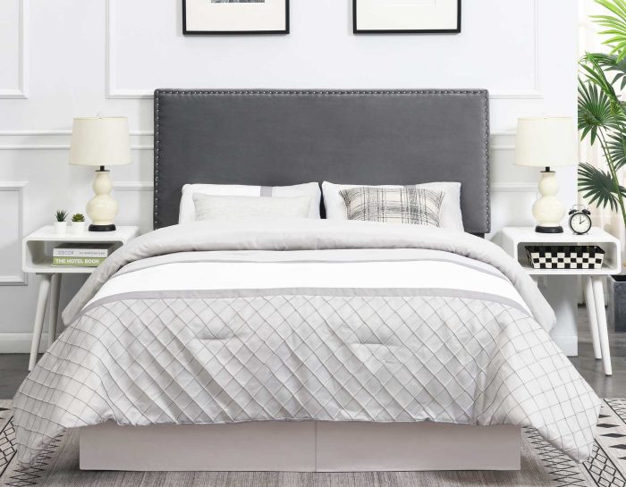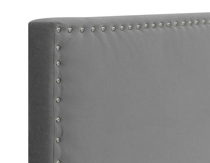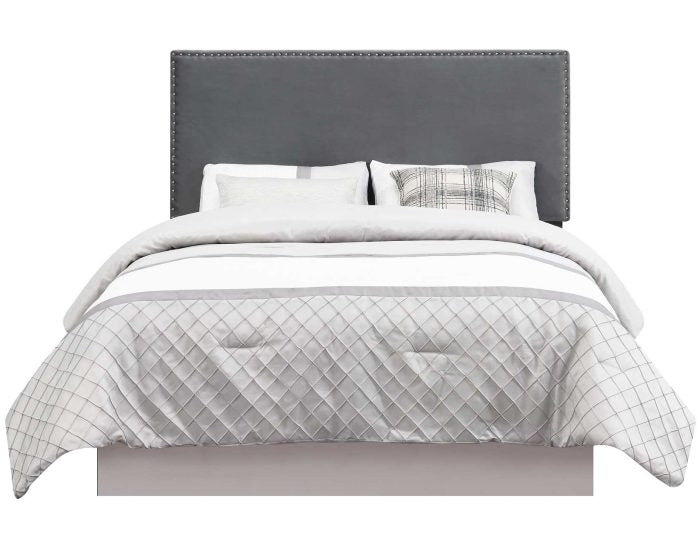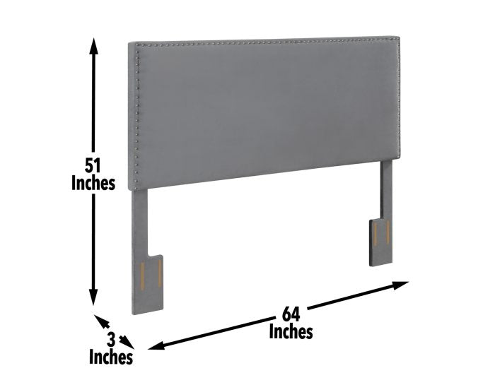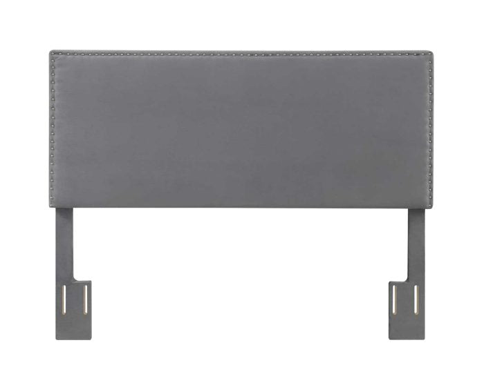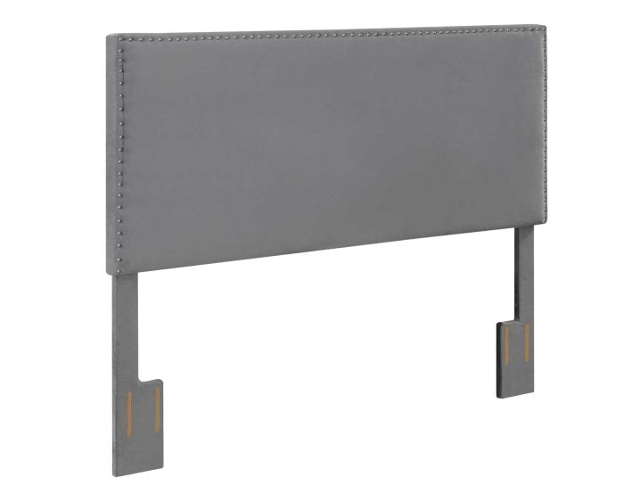 Soften your bedroom with a touch of fabric in the the Bergen Upholstered Headboard. Gray velvet and nailhead trim make this unisex headboard suitable for virtually any bedroom. Slotted for a full or queen bed, the Bergen headboard makes for a nice teen or young adult or college room as well.