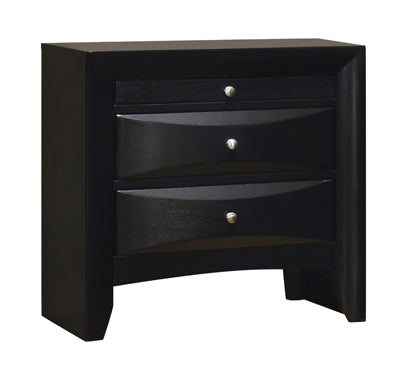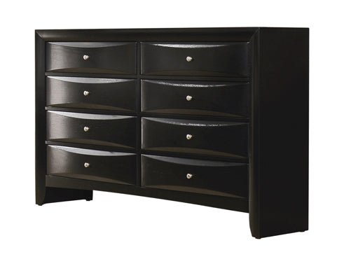From the Briana collection comes this smooth, transitional style 5-piece bedroom set for the master bedroom. The handsome storage bed offers function in the form of pull-out drawers in the headboard and footboard and two drop down drawers on either side. The chest, nightstand, and dresser are constructed with plenty of drawers with chambered edge fronts and brushed chrome knobs, affording ample storage space with added stylishness. The straight, clean rectangular mirror easily fits upon the stately dresser finish out the set. The entire set is finished in timeless black that's sure to match any home decor.