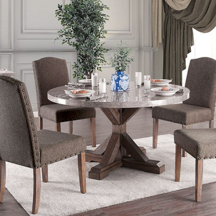 Celebrate the beauty of genuine marble with this dining table set. A heavy slab of cream colored marble rests atop a natural finished pedestal base almost as if you're displaying it to guests. The polished stone top is contrasted by cushy padded seating to help bring balance to your room. Rich gray fabric upholstery encases the seating fixtures, including a bench that helps keep the view of your table clear.