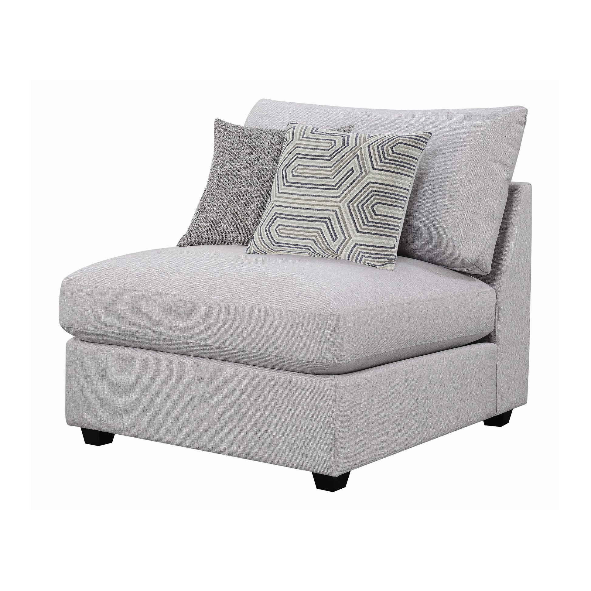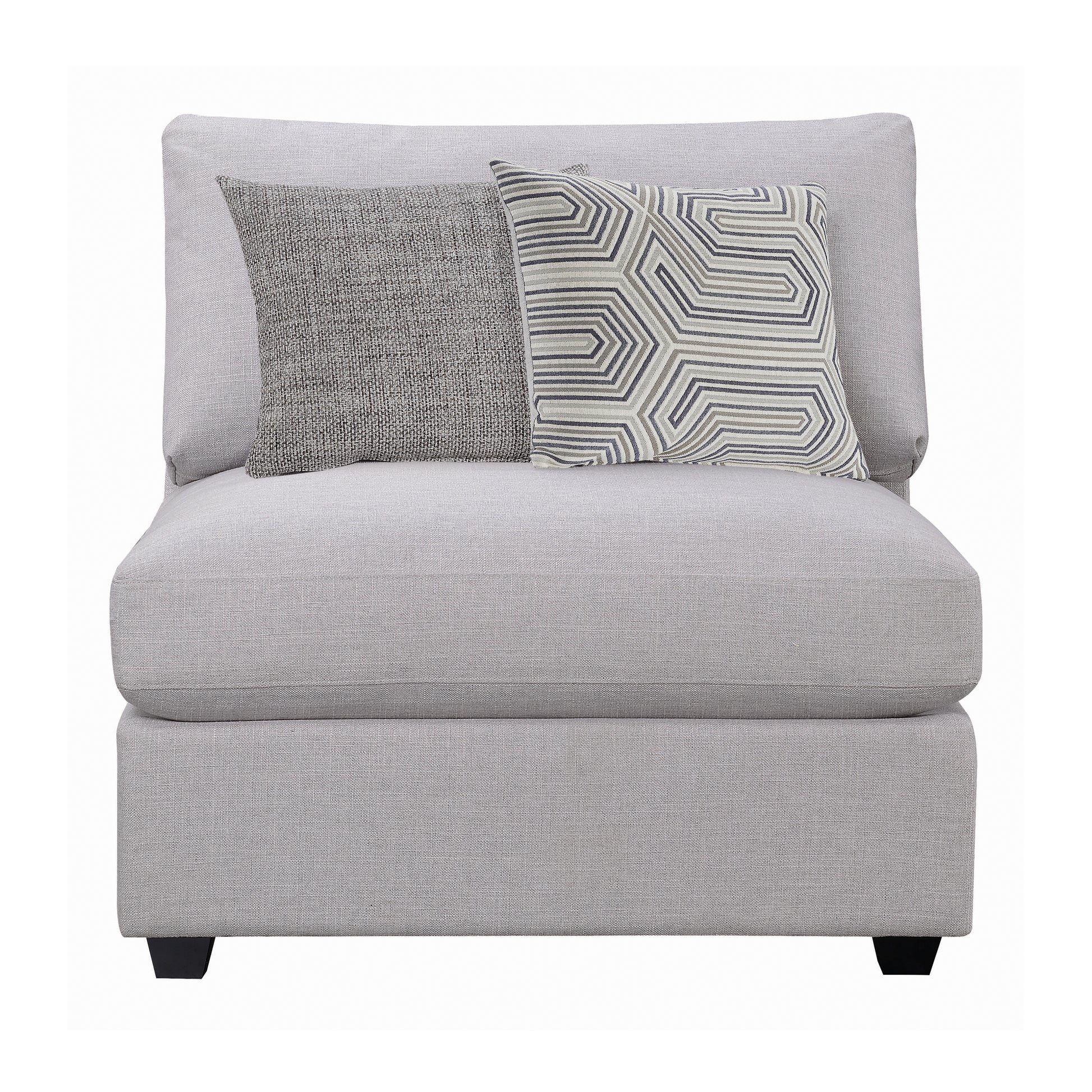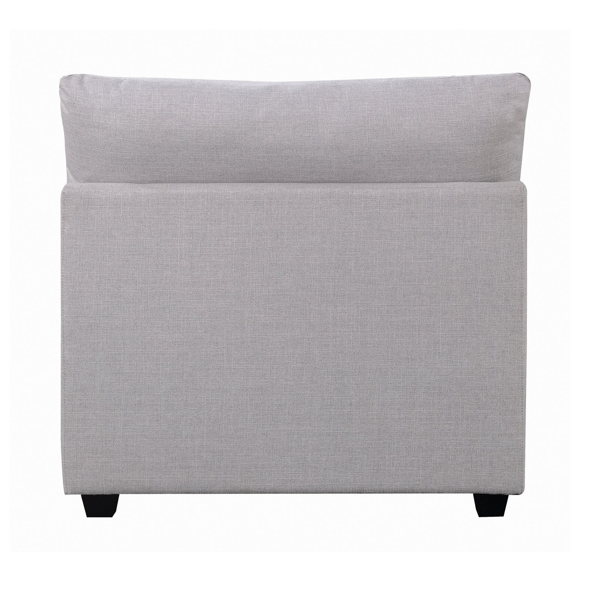 With a simple silhouette, this modern armless chair showcases contemporary design. Great for a neutral or colorful space, the light grey fabric upholstery complements a variety of decor schemes. Clean and elongated, the lines on the seat and back cushions mirror each other for an updated feel. Sink into the plush cushioning on a family movie night or game night.