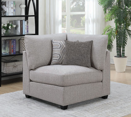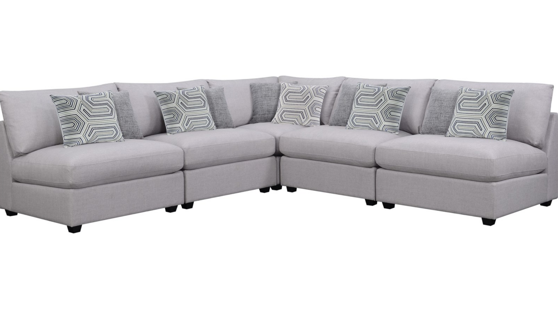 Complete a contemporary motif with the simple silhouette from this modern sectional Upholstered in light grey, the fabric complements a variety of neutral and colorful spaces. Ideal for hosts and families, the clean modular design allows for a fully customizable sofa or sectional. Update your seating with the clean and elongated lines on the seat and back cushions. Plush cushions and refined edges add an elegant feel that is full of comfort.