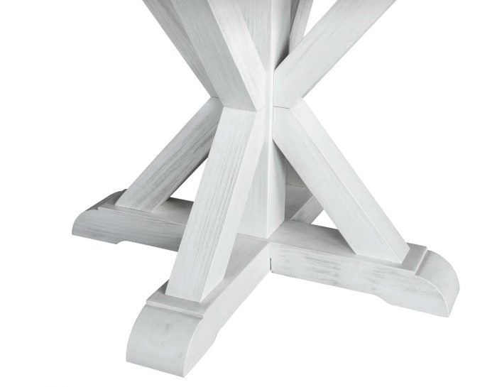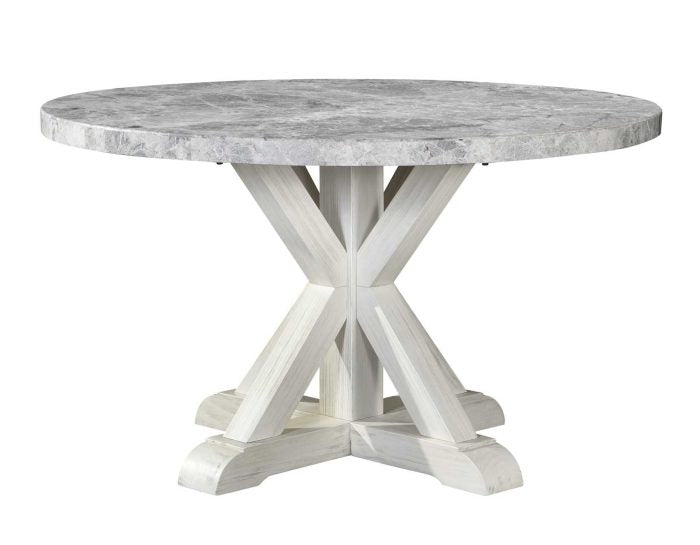 A charming 52-inch round table with a refined rustic style that combines the polish and beauty of a gray marble top with the rustic complement of a white timber-beam trestle base. The gray marble top has natural white veining that blends beautifully with the white finished table base. The casually elegant style of the table will fit beautifully in farmhouse, cottage, ranch or traditional settings.