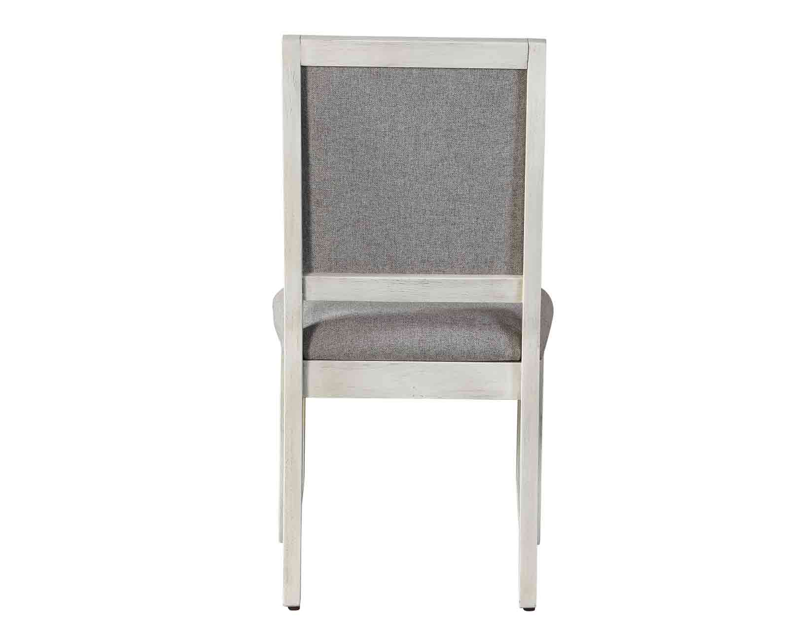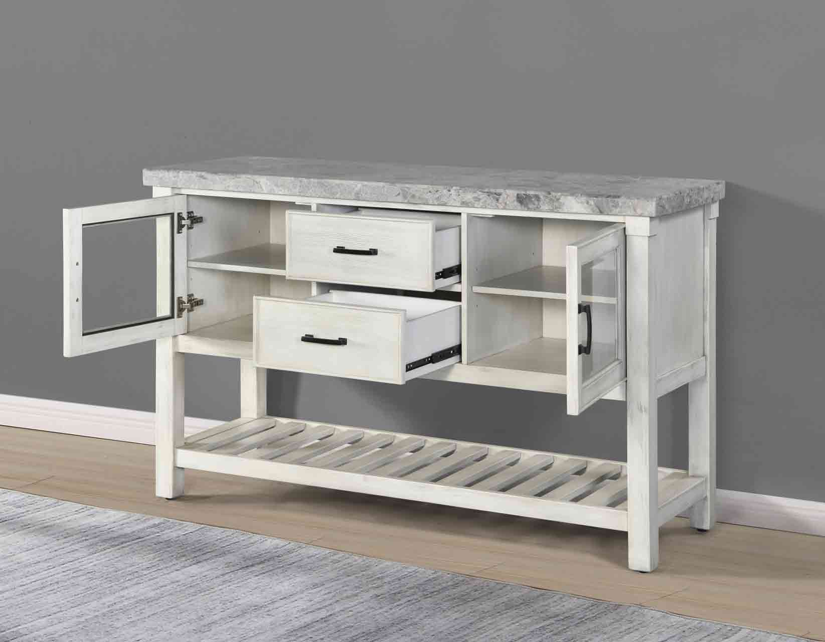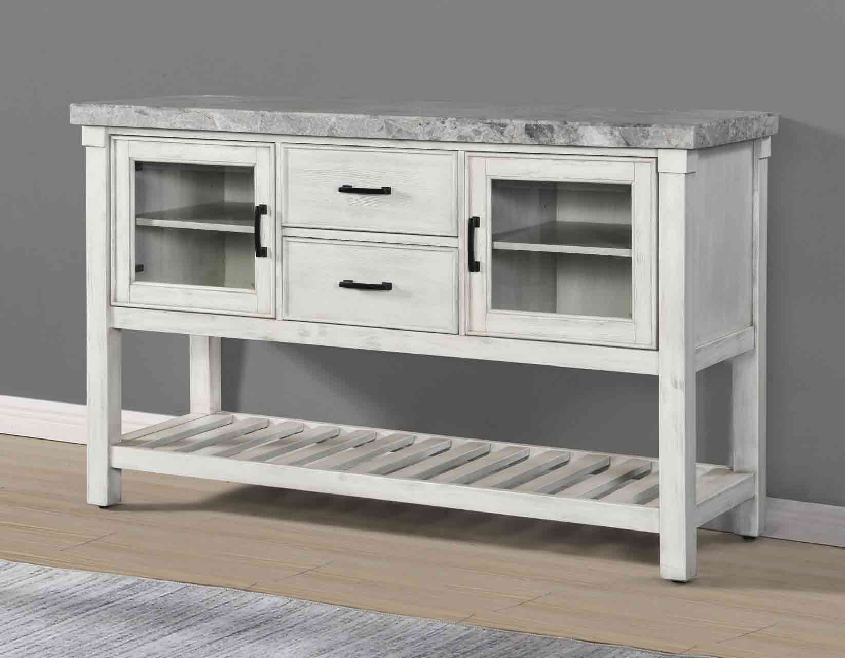 A 52-inch round table with a refined rustic style that combines the polish and beauty of a gray marble top with the rustic complement of a white timber-beam trestle base to form the centerpiece of this charming dining room set. White veining in the gray marble table top blends beautifully with the white finished table base and chairs for a harmonious design that seats up to six. The white and gray microfiber chair matches the set in an easy-care and comfortable seat. The casually elegant style of the table will fit beautifully in farmhouse, cottage, ranch or traditional settings and can be paired with the optional Canova Server for a full dining set.