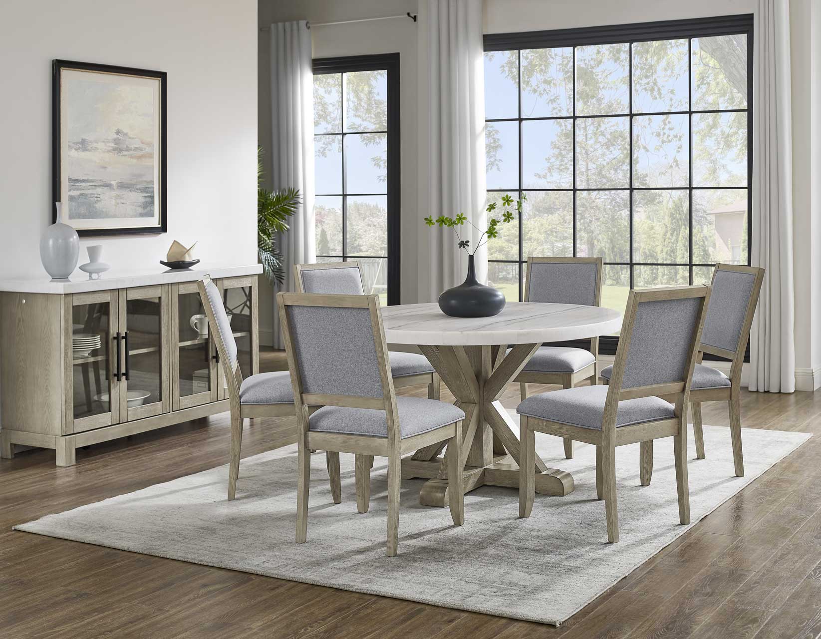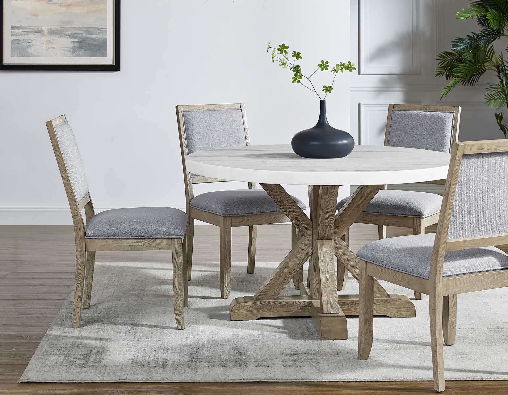 - Set includes 52-inch Round White Marble Top Dining Table and 4 Side Chairs.