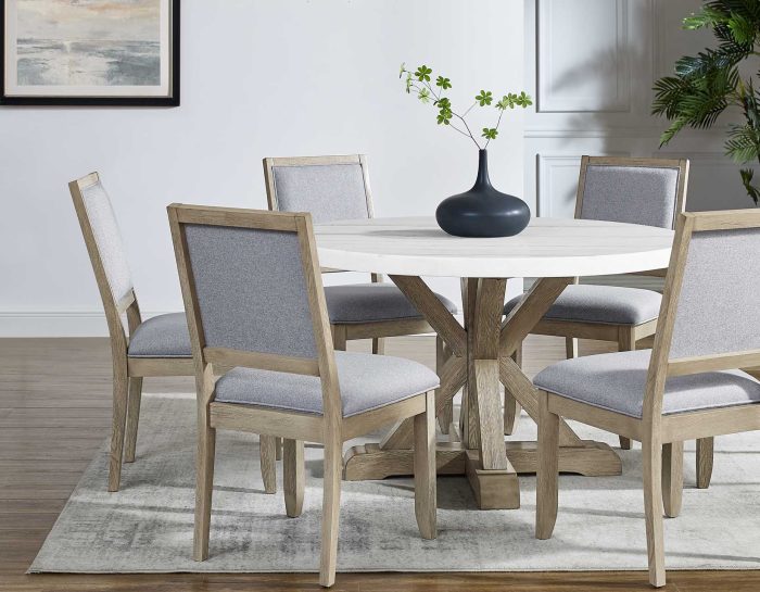 - The 52-inch round Marble Top Carena dining table offers a blend of strength and style with an elegant white marble top that comfortably seats six.
