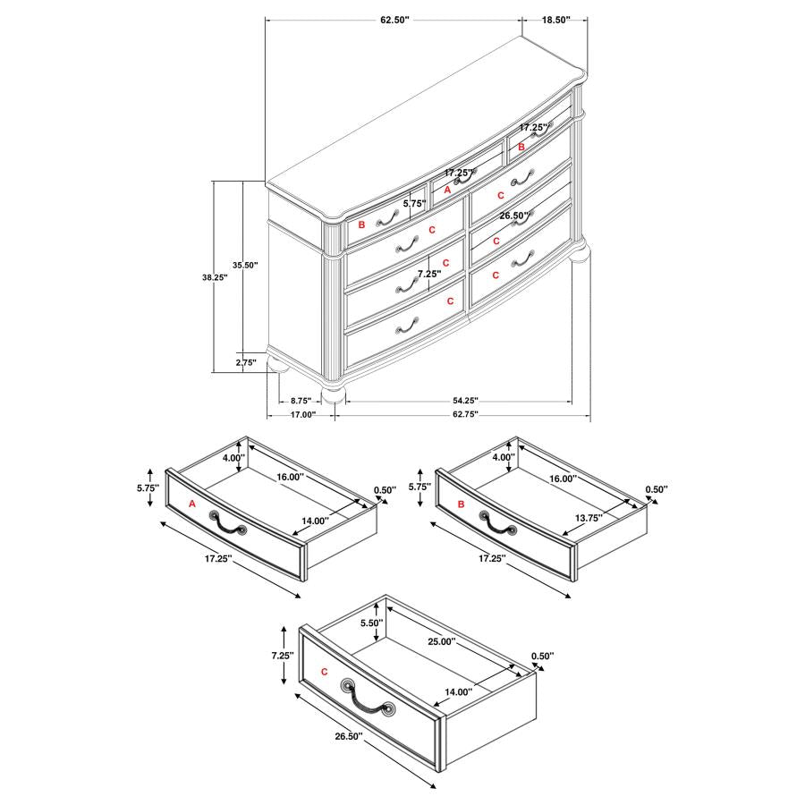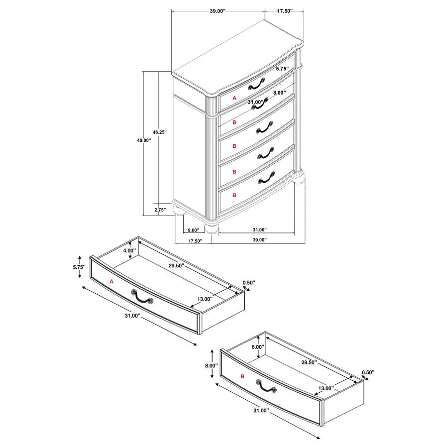 * Five-piece bedroom set includes queen bed, nightstand, dresser, dresser mirror, and chest * Queen bed with a regal tufted headboard and elegant woodworking * Nightstand offers three drawers, with a felt-lined top drawer for delicate items * Spacious nine-drawer dresser complemented by a stylish dresser mirror * Chest with five drawers, featuring a felt-lined top drawer for valuables |