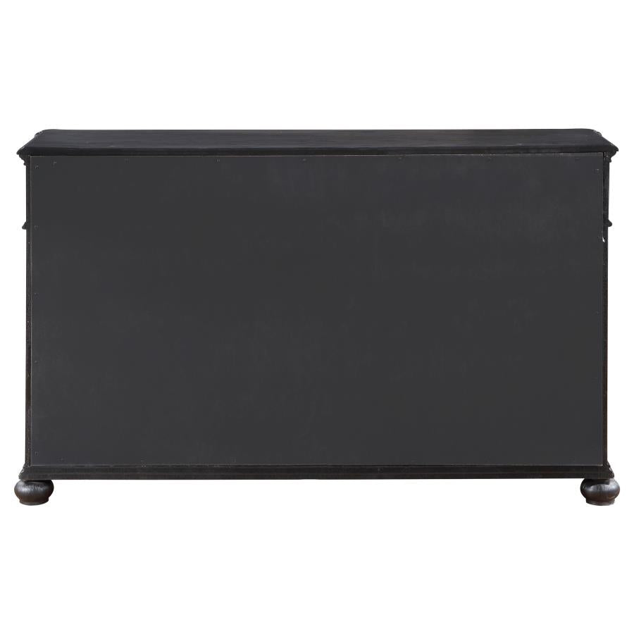 Elevate your bedroom's ambiance with this nine-drawer dresser, a piece that melds classic style with ample storage. The top drawers are felt-lined, offering a soft enclosure for jewelry and treasured items. Each drawer slides out smoothly, allowing for easy organization of your wardrobe. The dresser's substantial presence is accented by a black finish and ornate hardware, creating a statement of sophistication.