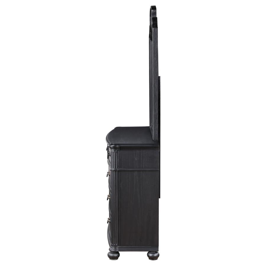 Transform your bedroom into an enclave of classic elegance with this nine-drawer dresser. The sophisticated design features felt-lined top drawers to protect your jewelry and cherished items, while the remaining drawers glide smoothly for effortless organization. With a substantial black finish and ornate hardware, this piece is both a statement of style and a haven of storage. Paired with it is the elegant dresser mirror, framed in matching dark tones, which amplifies beauty and light, enhancing your dressing experience in an atmosphere of refined luxury.