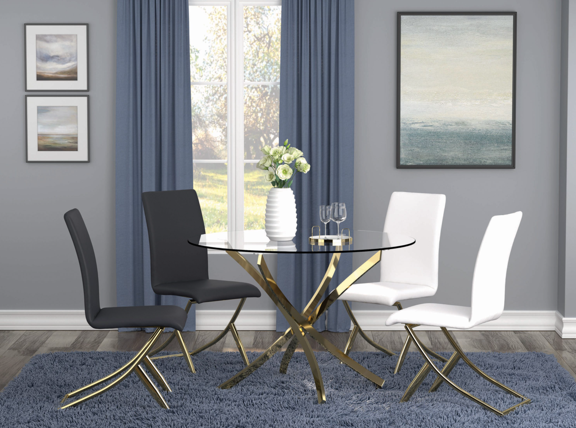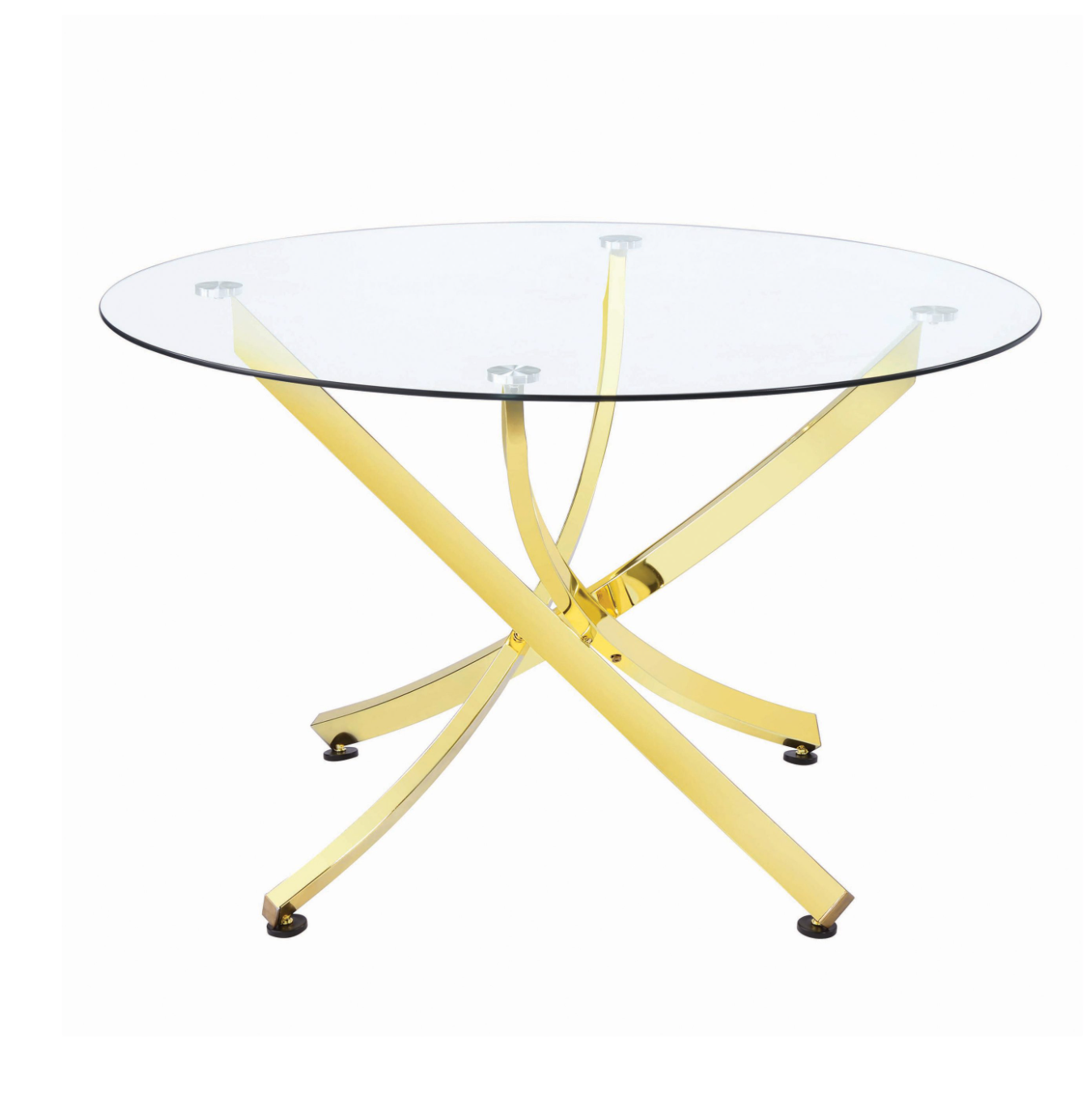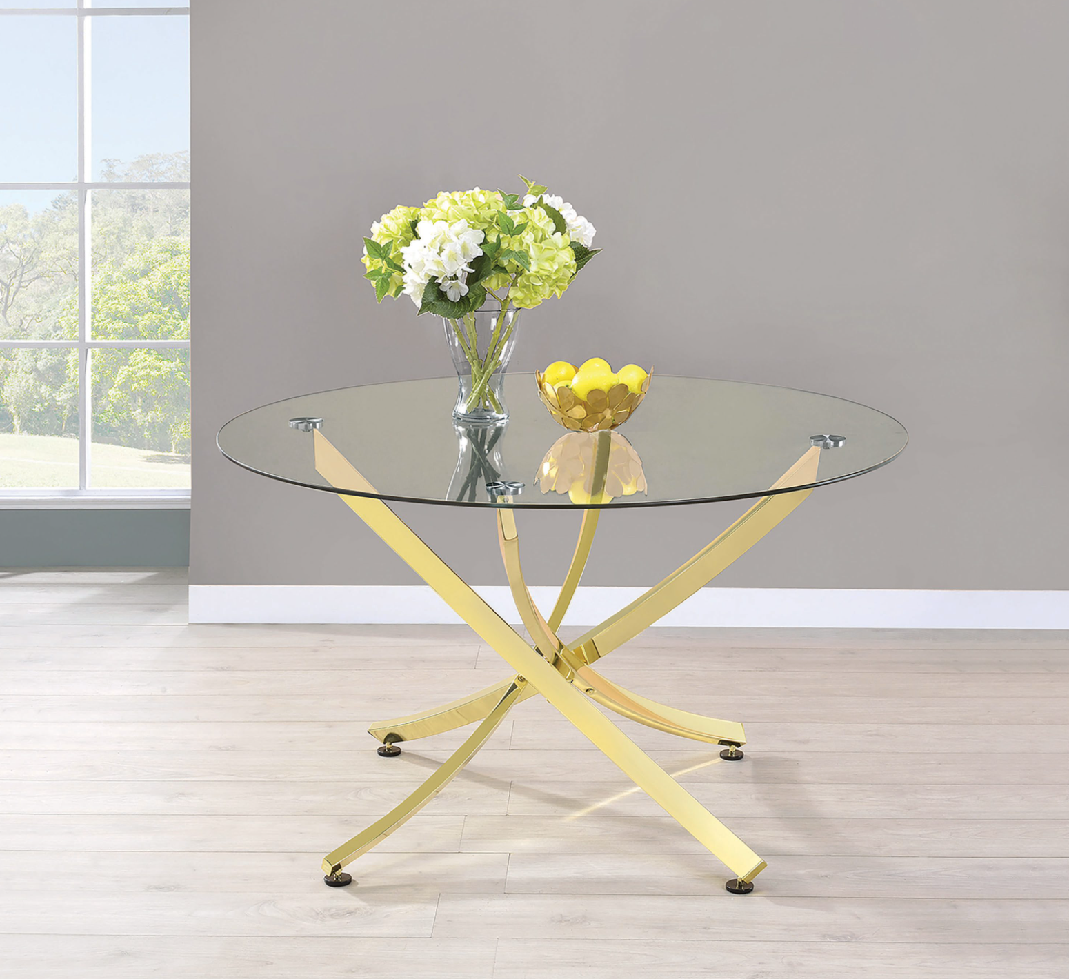 Stay on the edge of contemporary glamour. This dinette table indulges a love of clear glass and embellishes it with a radiant brass finish frame. Artfully designed, its base offers eye-pleasing contoured strips. A round glass top delivers sophistication and elegance. This gorgeous table features floor-protecting discs under each leg.