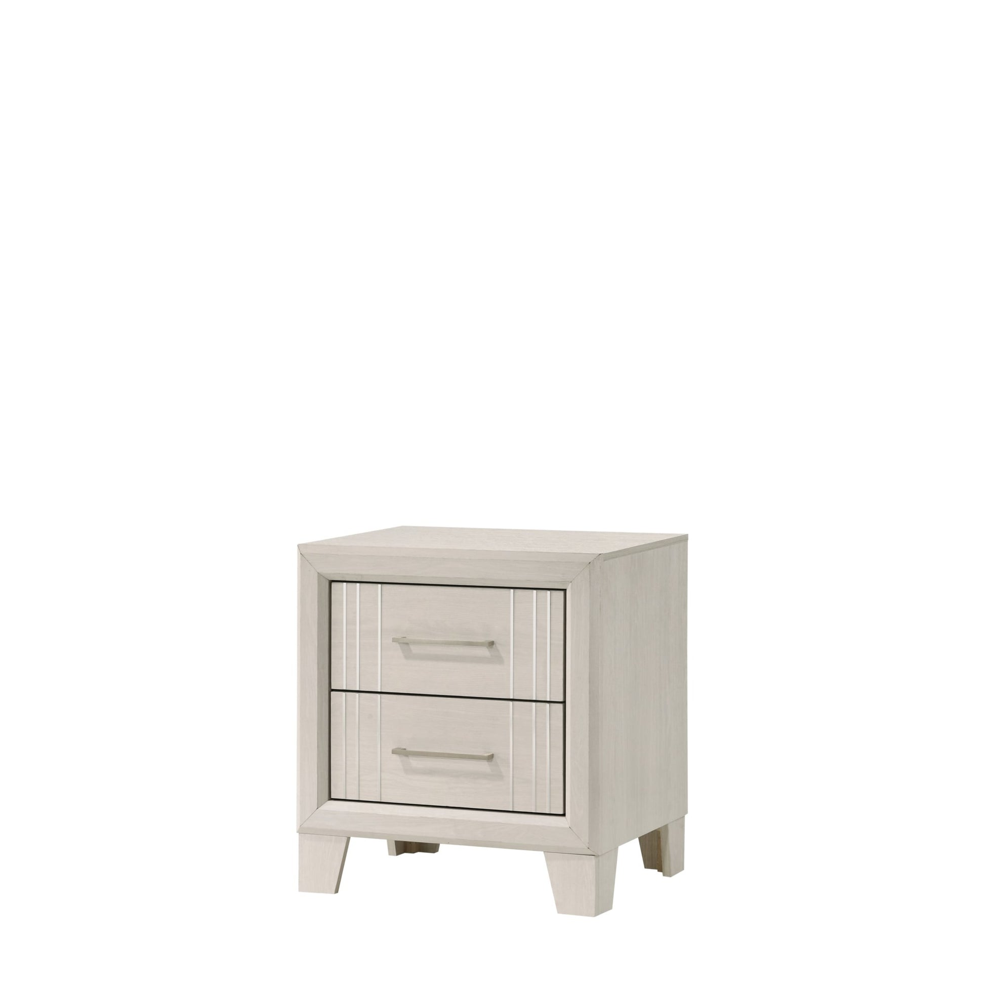 This elegant bedroom collection presents a sophisticated ensemble perfect for creating a refined modern aesthetic in your sleeping quarters. The suite features a sleek, minimalist design with crisp, clean lines and a lustrous white finish that exudes contemporary charm. Anchoring the set is a robust panel bed with a prominent headboard, promising a sturdy and stylish centerpiece. Flanking the bed are complementary case pieces, offering ample storage with their smooth-gliding drawers accented with chic silver-toned hardware.