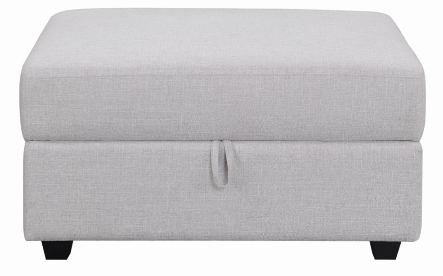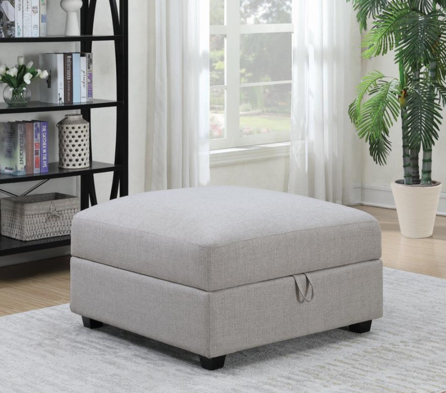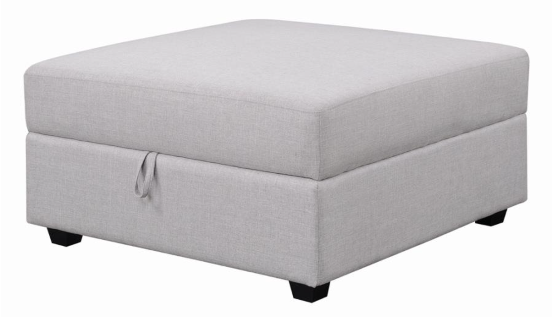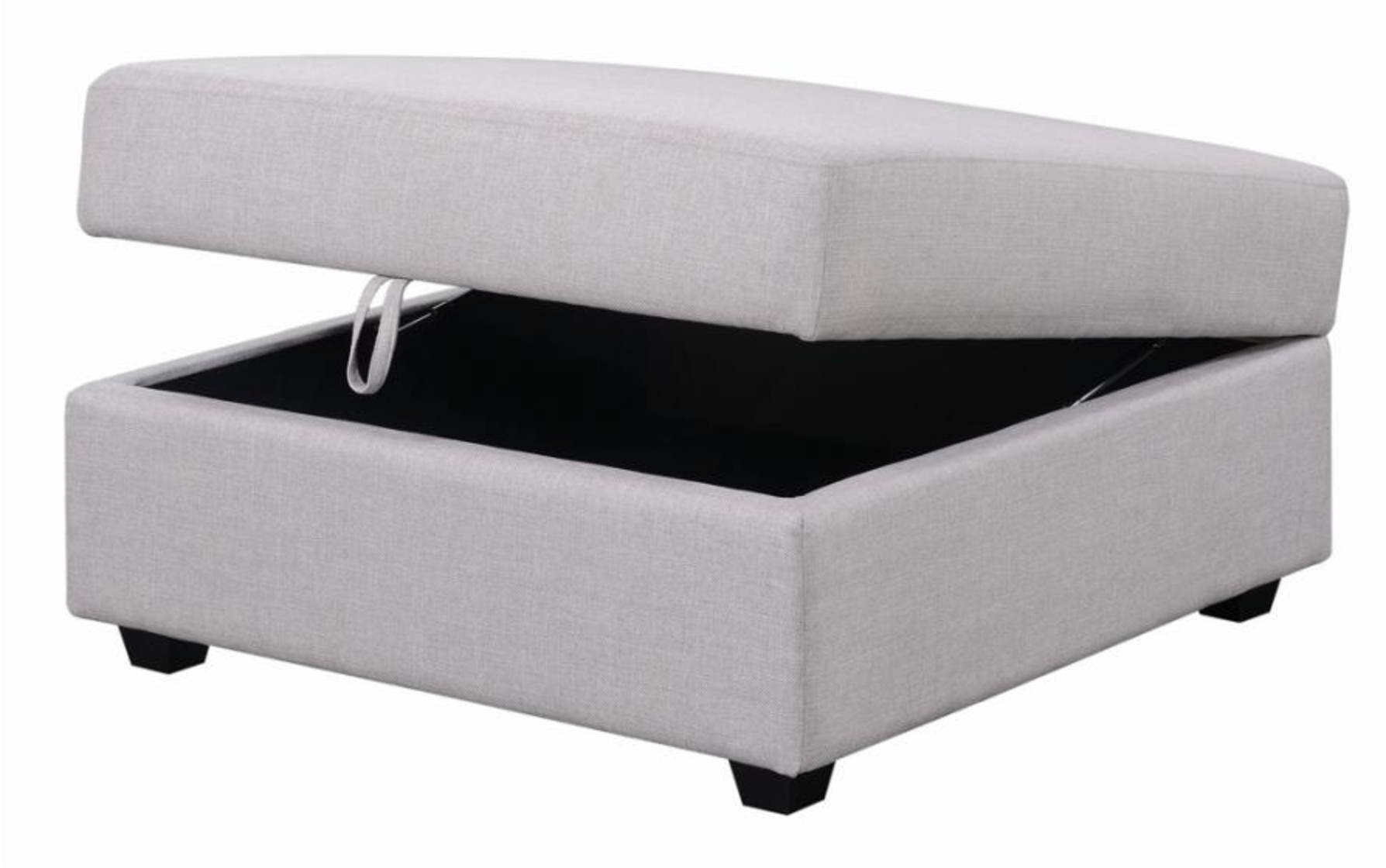 Upgrade a living room with the extra space from this grey storage ottoman. The simple silhouette showcases modern design with its clean lines. Store pillows, throws, and extra toys in the hidden compartment for a clean look. Beautiful with a variety of decor schemes, the lightly hued upholstery complements neutral and colorful motifs. Pair with the armless chairs from the modular sectional to create a chair, or place in the center for a plush footrest or extra seating.