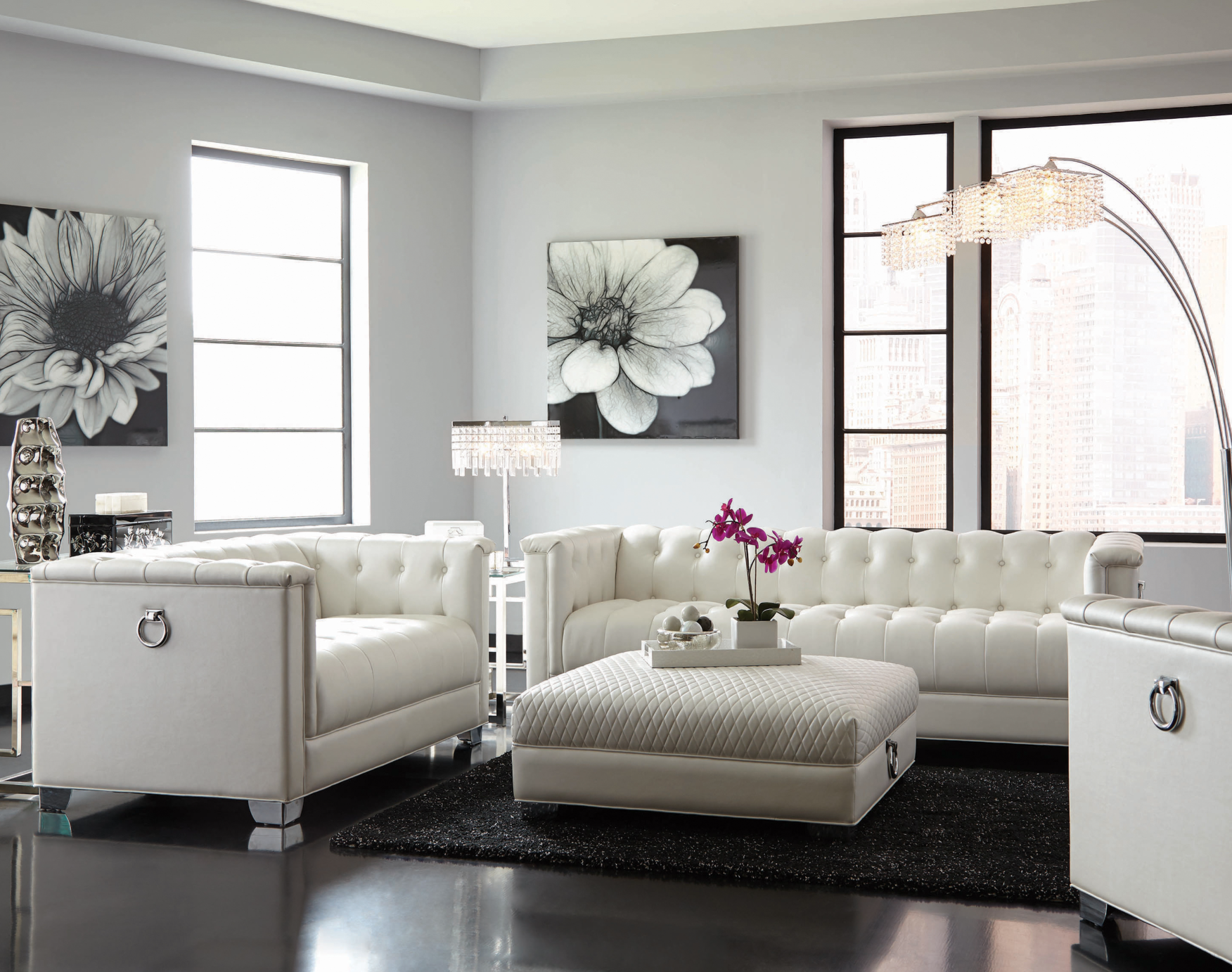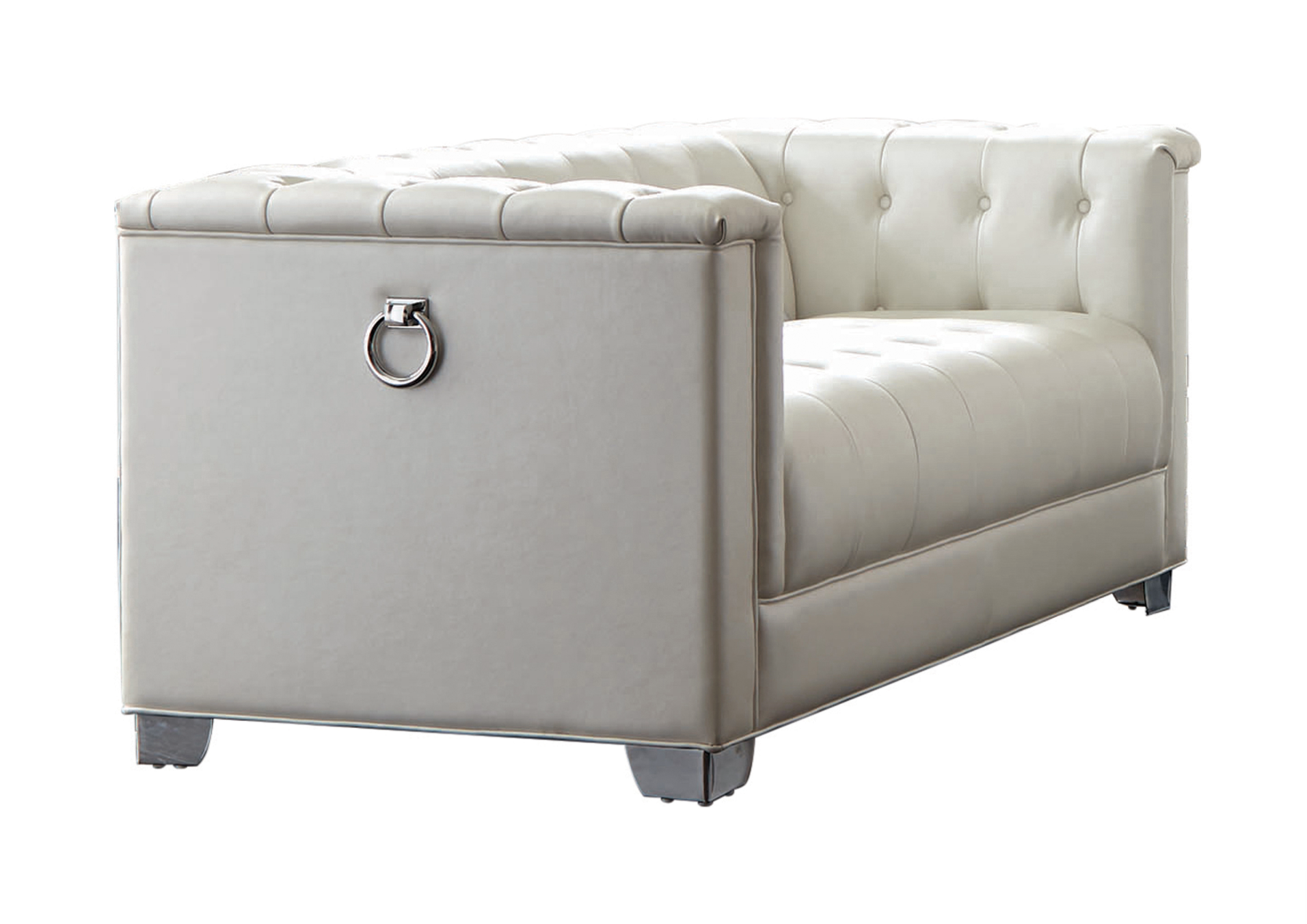 THIS GLAMOUROUS AND STYLISH COLLECTION FEATURES A Contemporary styling low profile set, WITH Deep button tufting, Heavy duty chrome doorknocker handles, Quilted detailing on the ottoman, AND Chrome legs. UPHOLSTERED IN PADDED BREATHABLE LEATHERTTE.