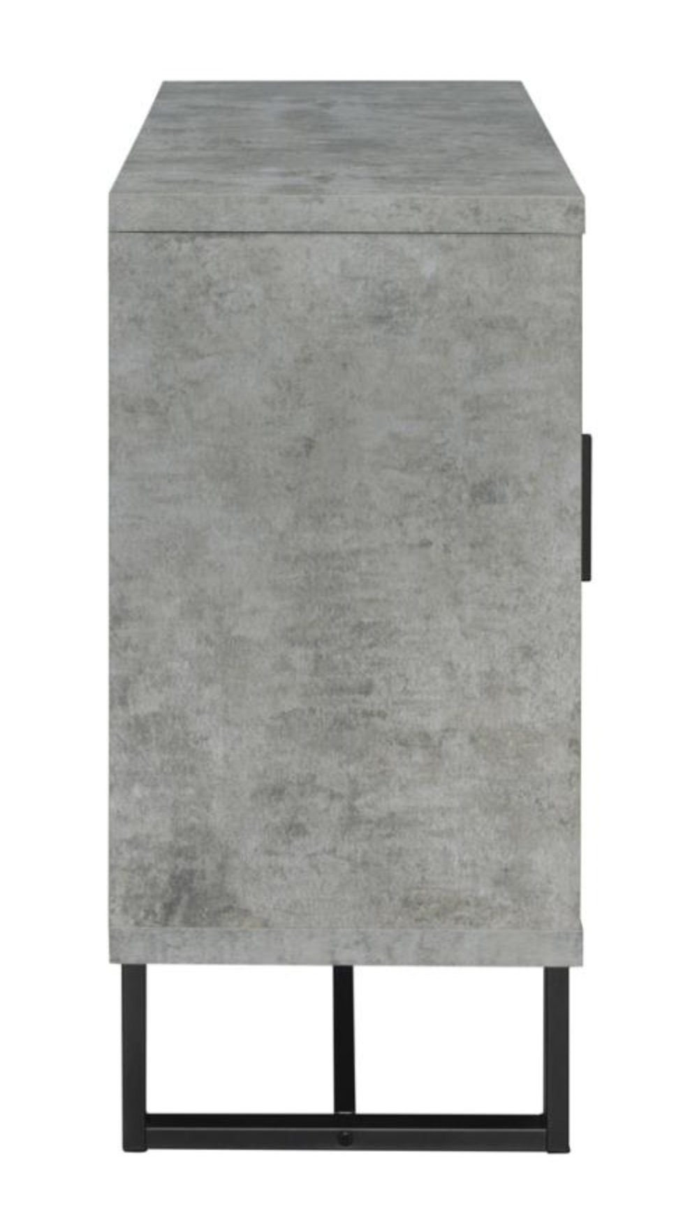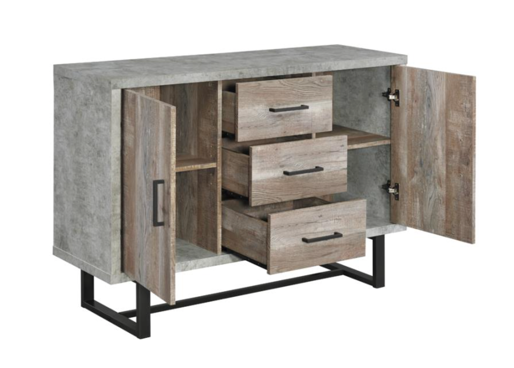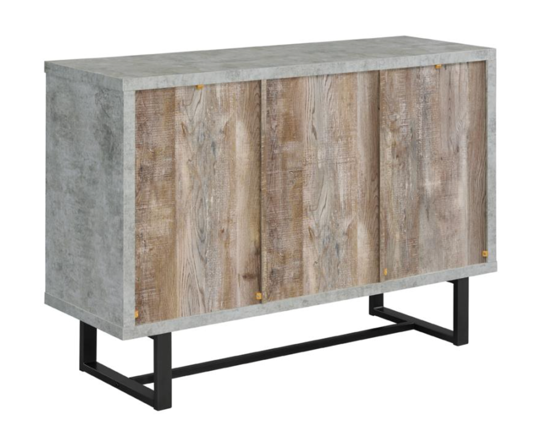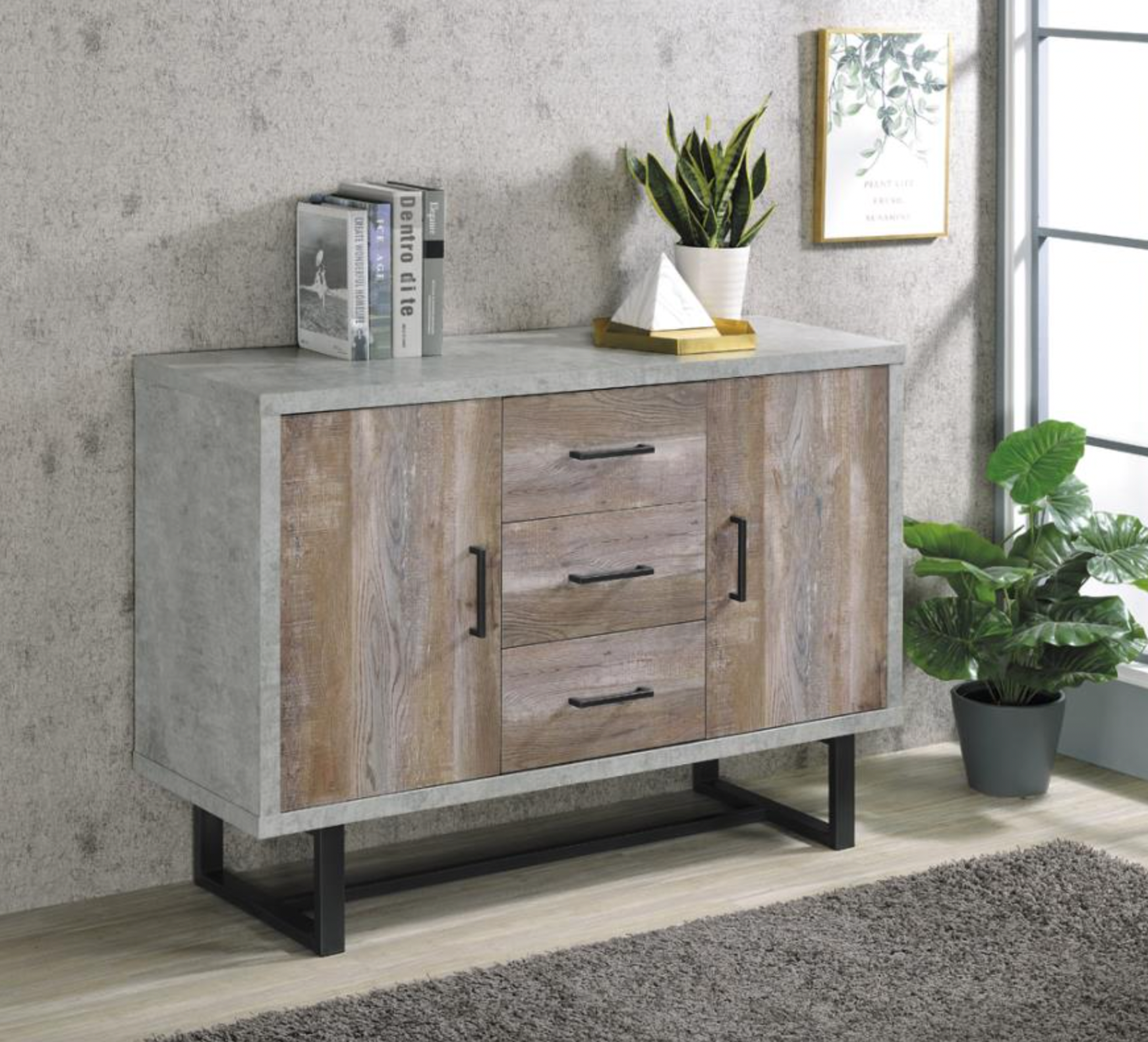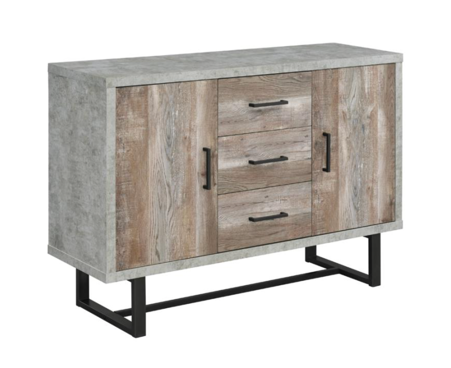 * Finish: Cement/Weathered Oak * Hardware finish: Gunmetal * Doors: 2 * Drawers: 3 * Shelves: 2 * Assembly type: RTA |
