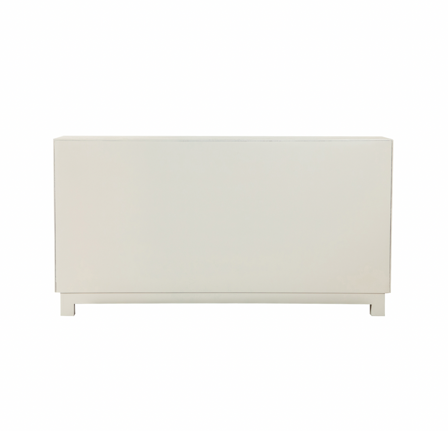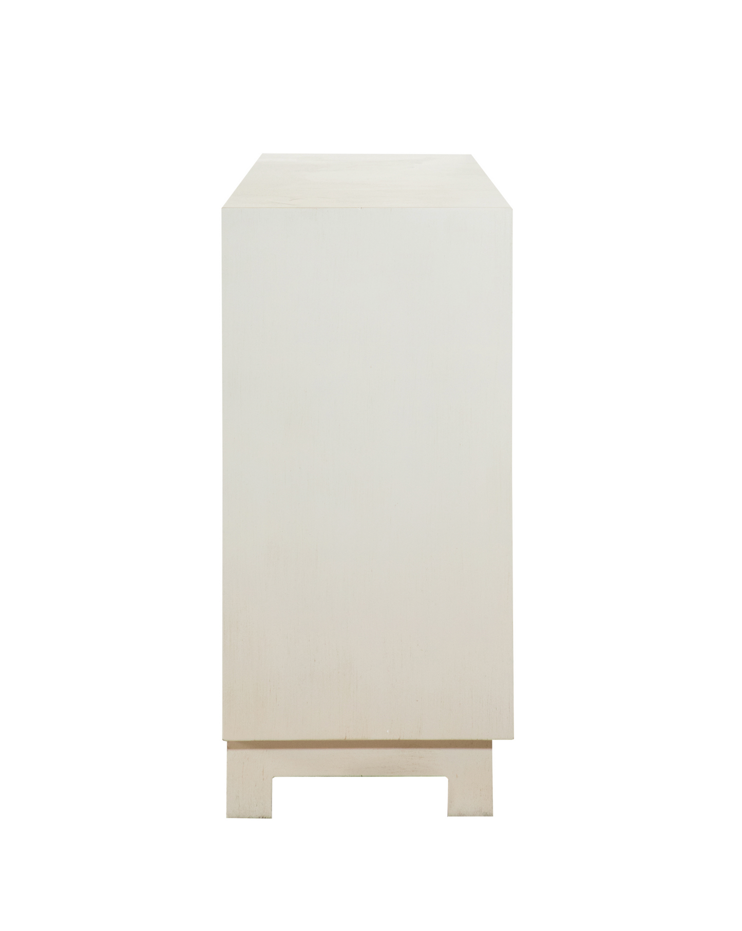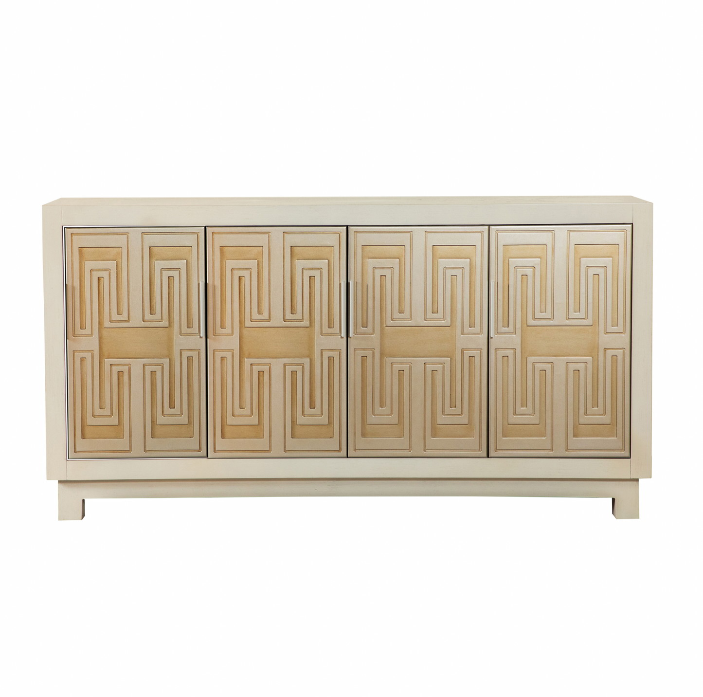 For an accent table that strikes up an instant conversation, you can't go wrong with this piece. A Greek key design on the cabinet door panels add texture and pizzazz. The white, gold, and silver color palette makes an immediate upgrade inside your home. Find plenty of storage space within the four cabinet doors and three interior shelves inside. This accent cabinet is supported on block style legs.