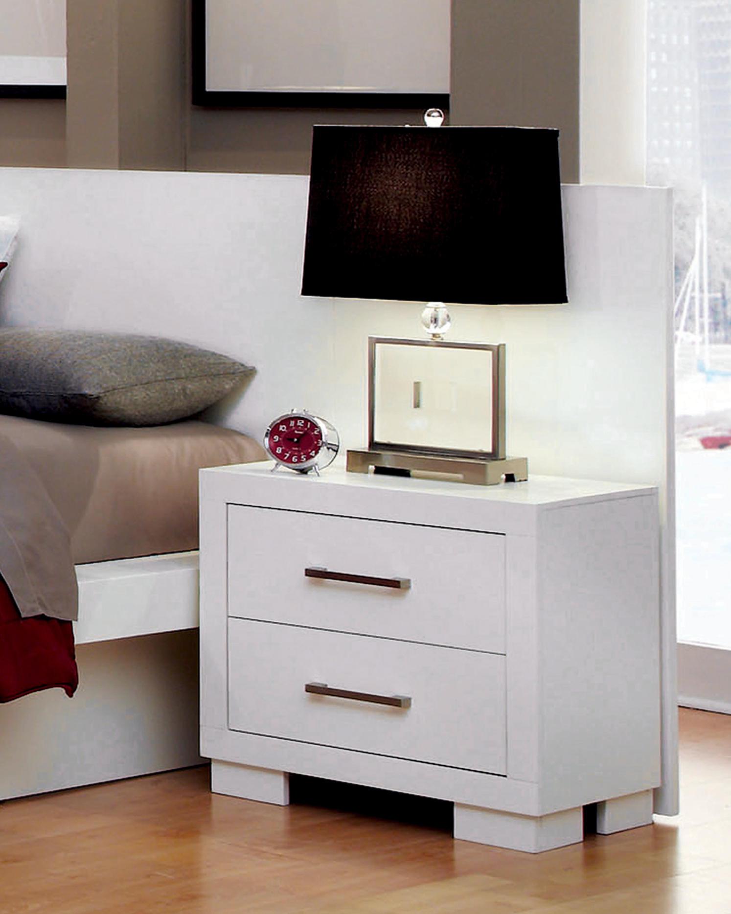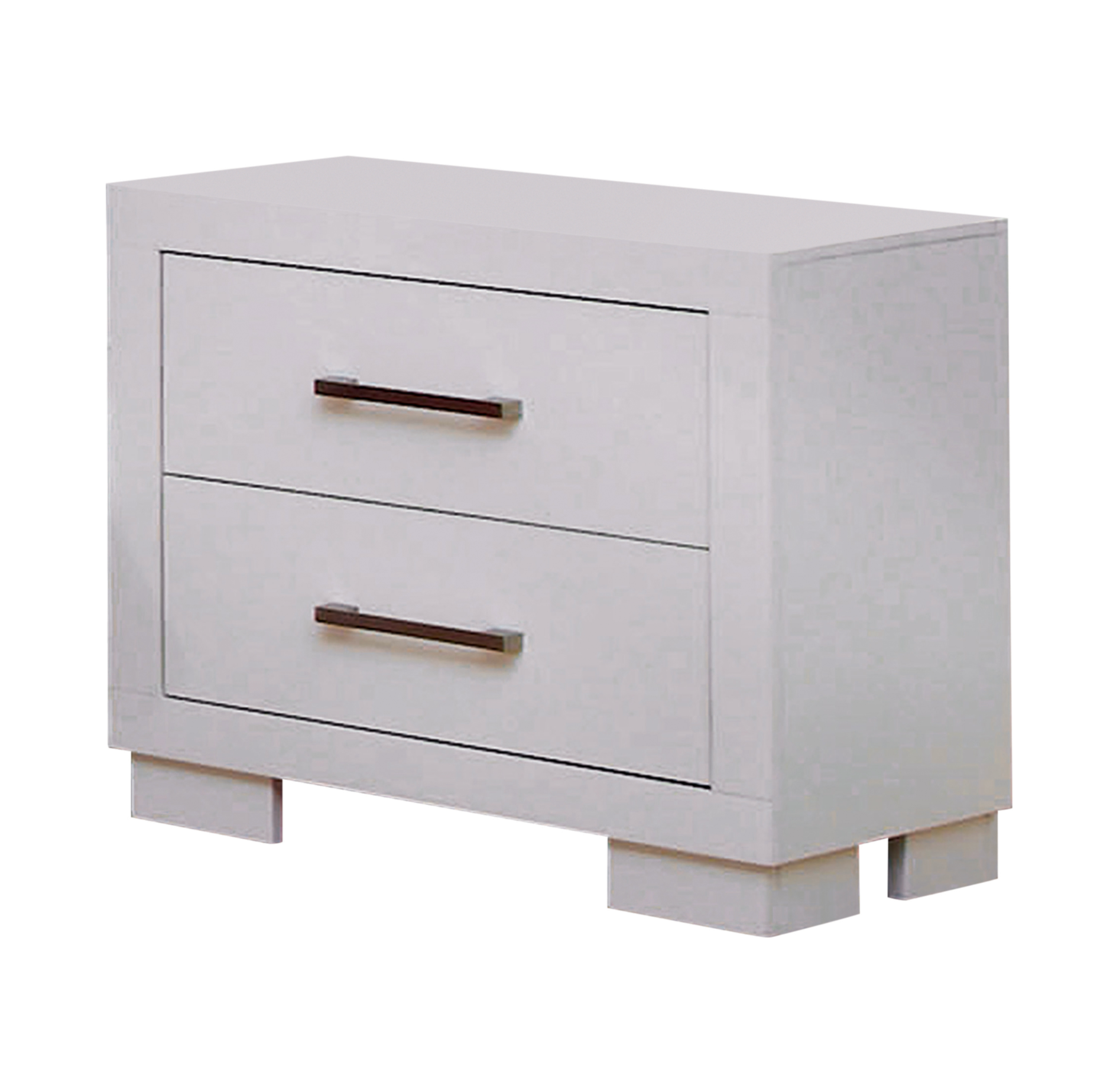 Sleek, stylish, and modern, this nightstand is a pleasing addition to any bedroom. Crafted from solid wood, it provides a sturdy surface for books, lamps, vases, and more. A soft, simple white finish provides an appealing contrast to its sharp, contemporary silhouette. Silver tone bar handles round out its glamorous look. Two spacious drawers offer ample storage space, helping to keep your room neat and organized.