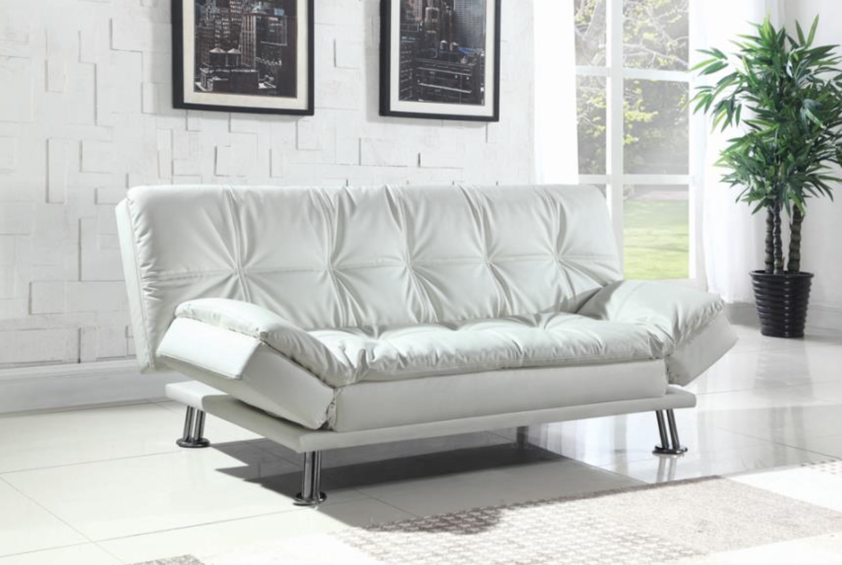 The contemporary Dilleston collection presents this sofa bed and futon that adds distinctive style and function to a family room or living room. It's upholstered in dashing grey leatherette that matches any decor. Plush pillow-top seating simply enwraps you in comfort. Adjustable armrests hold your arms or head, depending on your mood. Also available in black, white, or brown as well as matching chaise and storage ottoman (available separately).
