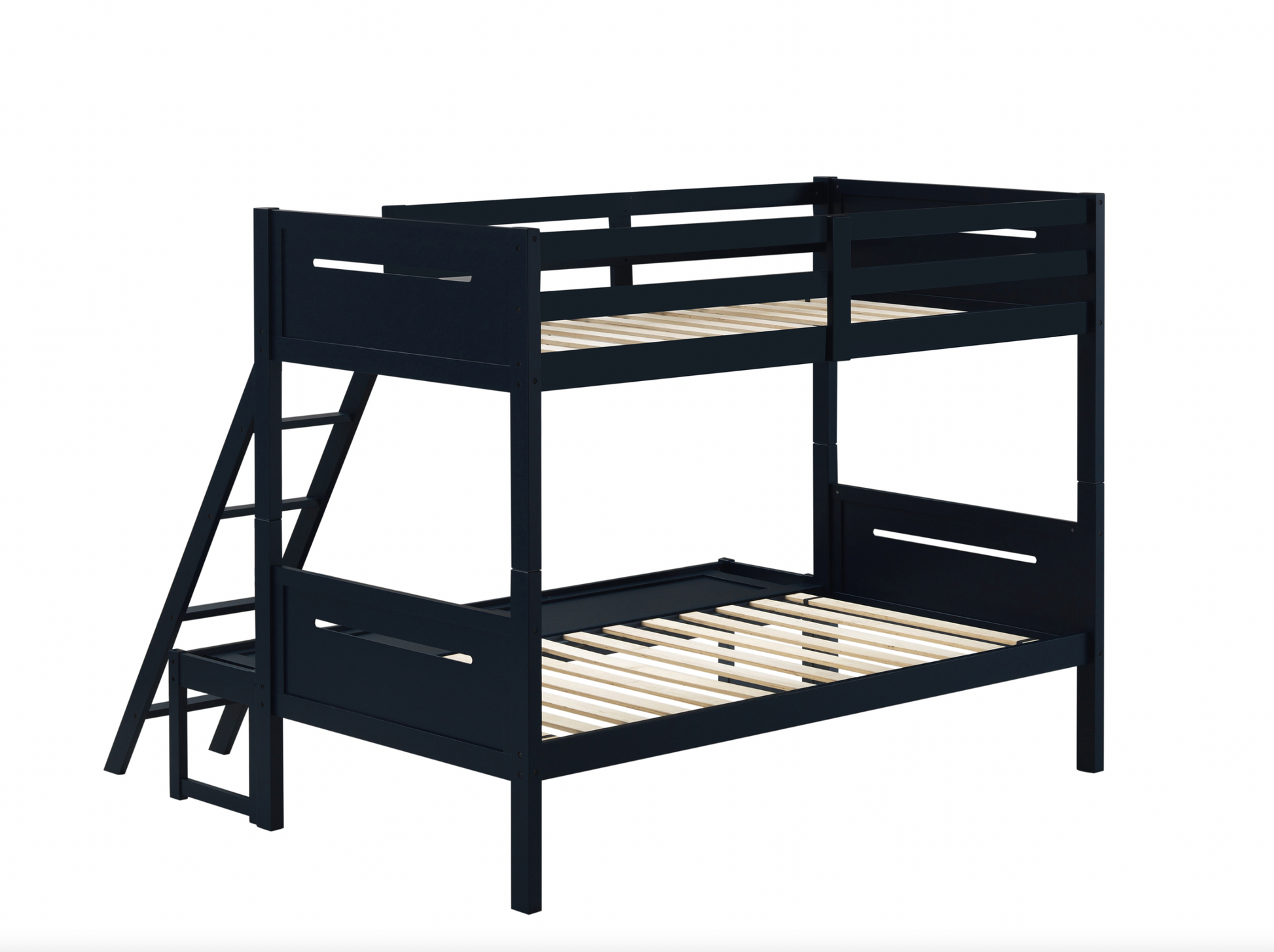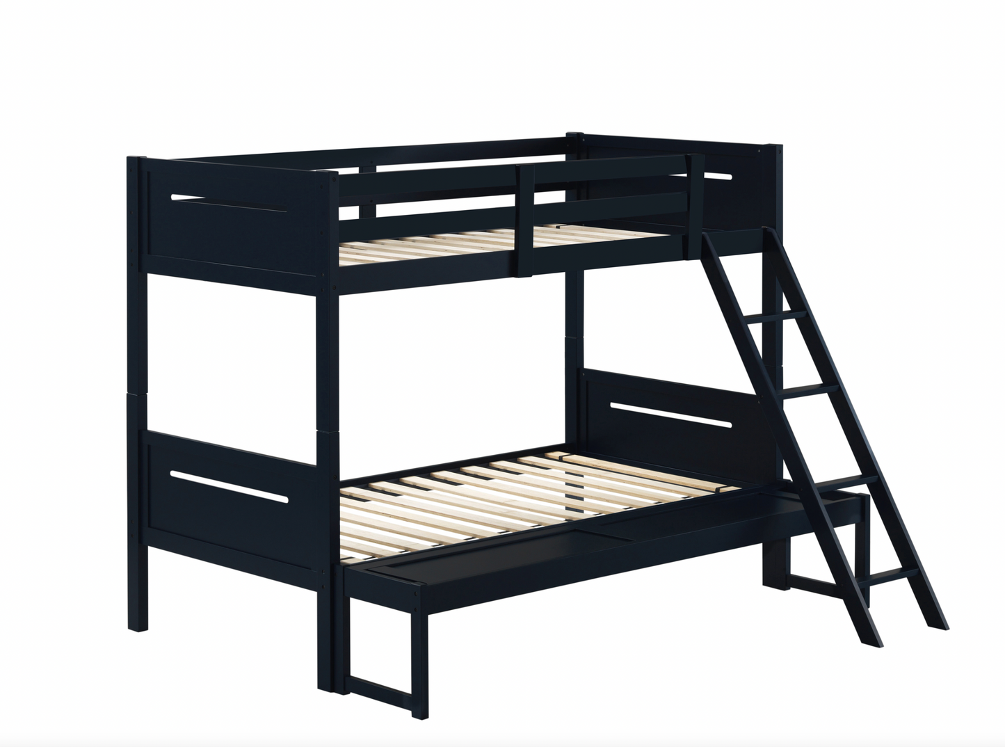 Space-saving with a clean and minimalist aesthetic, this youth bunk bed features a modern style frame that lends a masculine vibe.Perfect for making more floor space, this bunk bed offers a square design with a straight headboard and footboard, each with a slim notched out space.Available in several colors, this bunk bed complements any room's current color palette.An angled ladder allows kids to get to the top bunk, which also offers secure guardrails on each side.The bunk bed can be separated into two to create side by side beds as well.