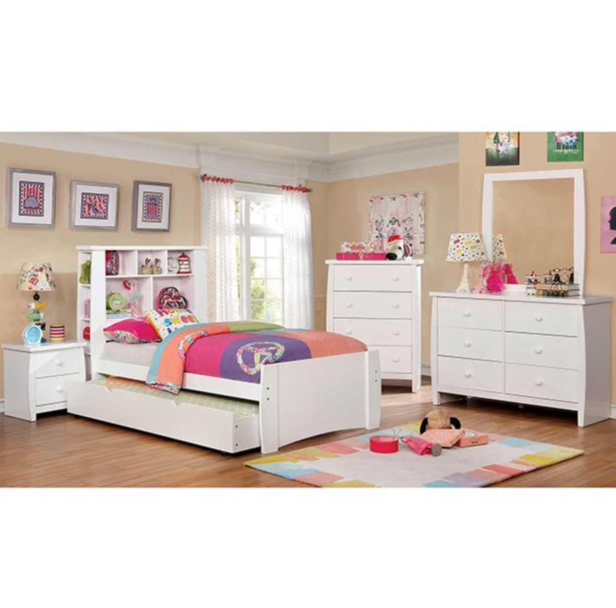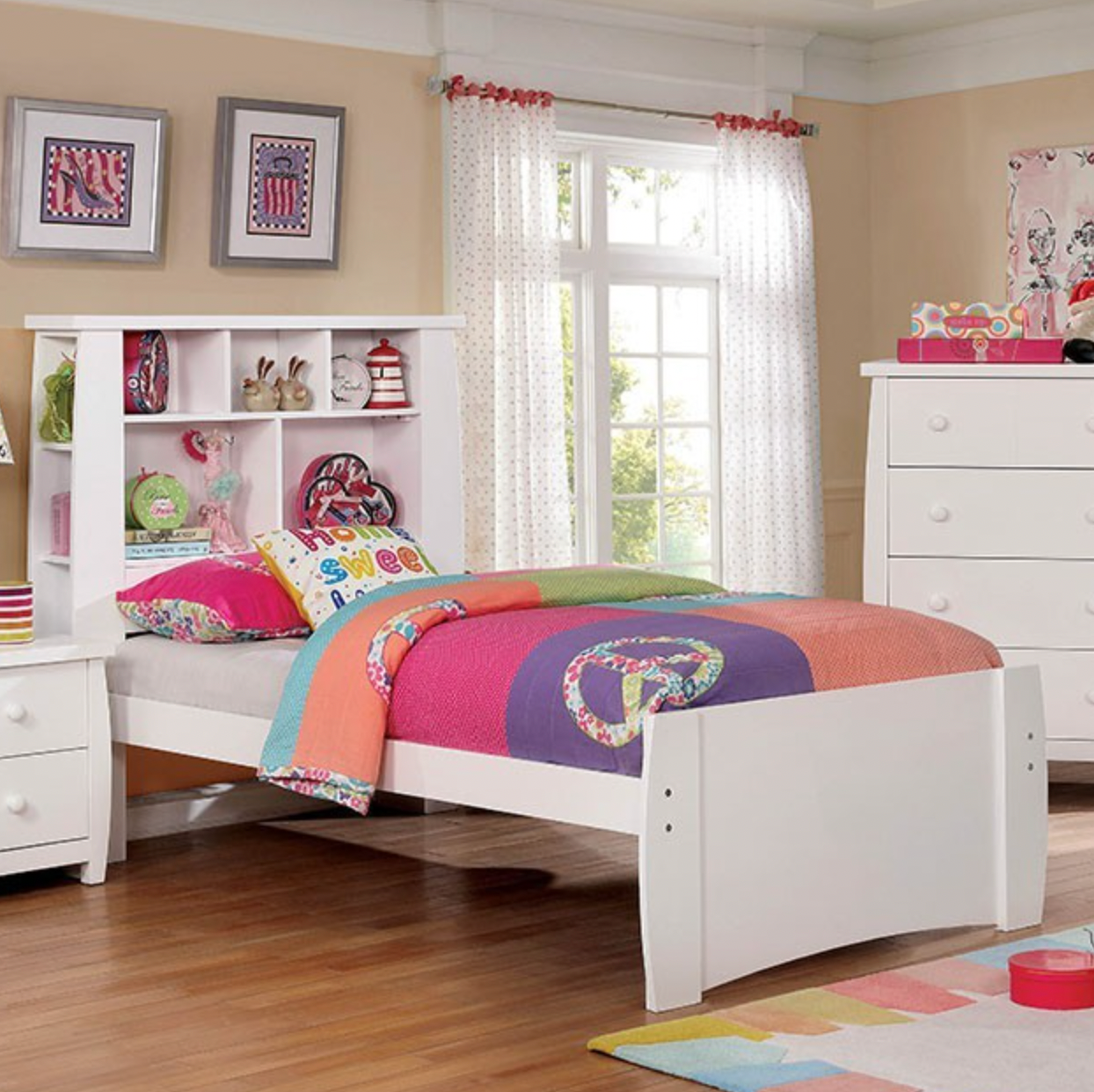 Add a transitional flair to your kid's room with this stunning collection. A bookshelf style headboard with additional shelving on both sides is perfect for holding books or toys. The curving sides give this bedroom set a modern look without becoming overtly complex or introducing different materials.