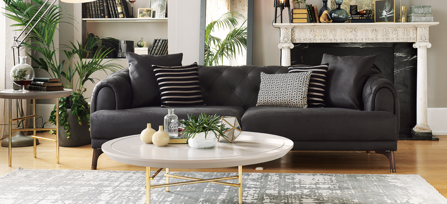 Supreme Comfort Dignified in Details. Featuring aesthetic and supreme comfort design features of contemporary living spaces and impressive materials and colour combinations together, the Navona Living Room brings a contemporary, chic and flamboyant decoration style to living spaces. Standing out with its velvet and leather-look fabric alternatives and striking colour usage, the Navona Living Room creates sophisticated details with its special stitching details on the back and arms and the wooden leg design with brass shoes.
