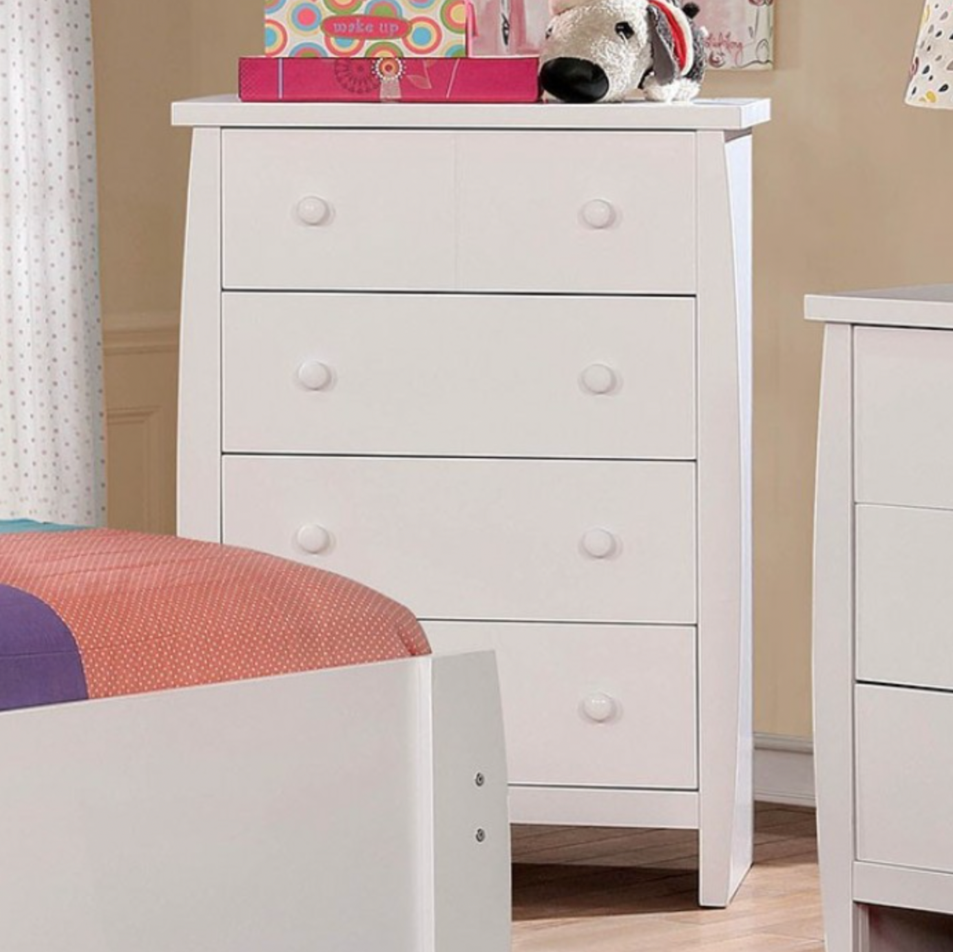 Add a transitional flair to your kid's room with this stunning bedroom chest. The curving sides and round drawer pulls give this bedroom set a modern look without becoming overtly complex or introducing different materials. This five drawer chest stands tall but sits sturdy on flat side feet.