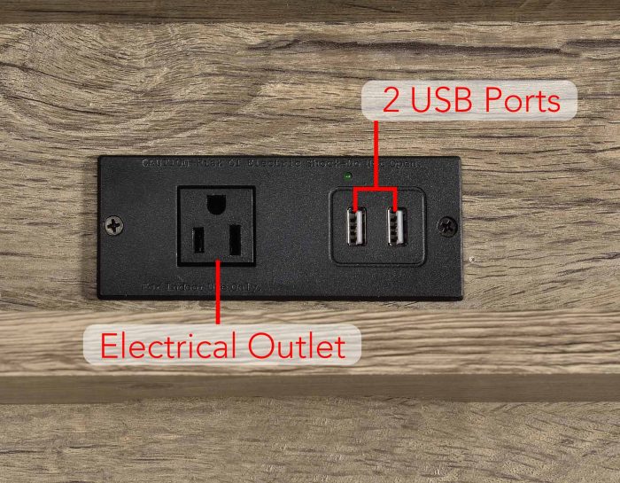 - 2 USB ports and electrical outlet in back panel for easy charging