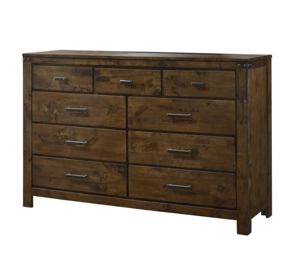 The Curtis Oversize 9 Drawer Dresser with Beveled mirror is the perfect addition to your bedroom. This beautiful dresser is made of brown wood and solids with a beveled mirror. The English dovetail drawers are front and back on all cases and have decorative metal strapping. The Kenlin metal center runners will not buckle with humidity changes and the dust proof bottoms protect your furniture from dirt and dust. With its sleek, stylish design, this dresser will complement any bedroom décor.