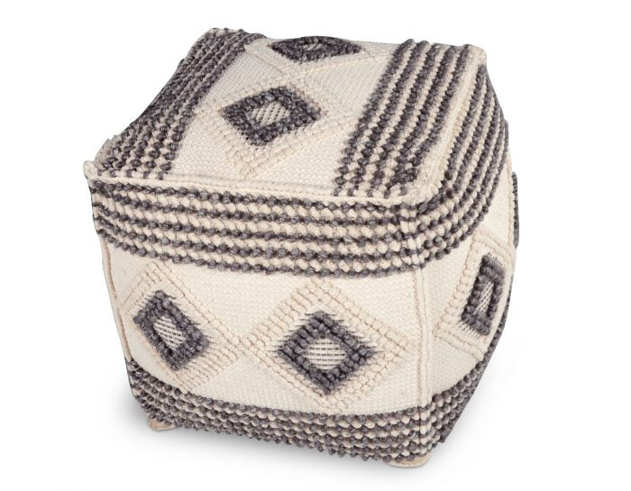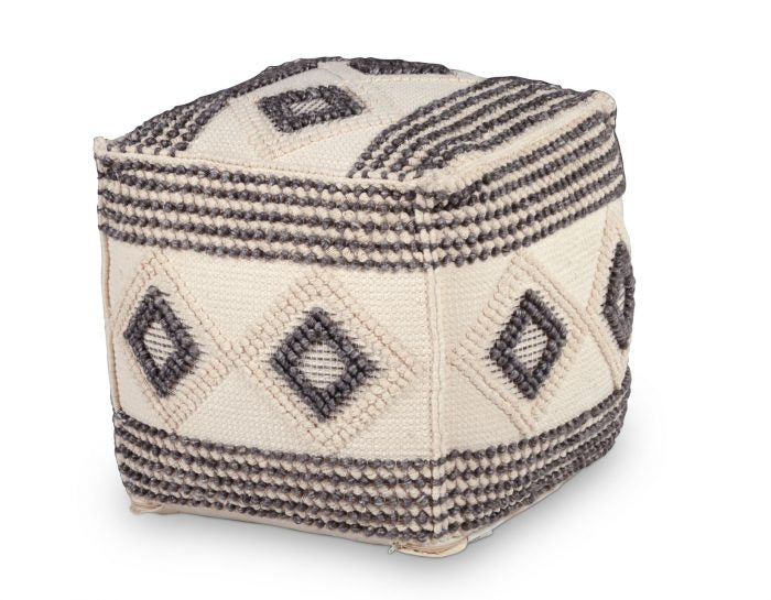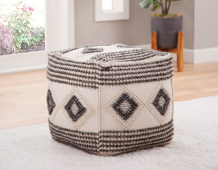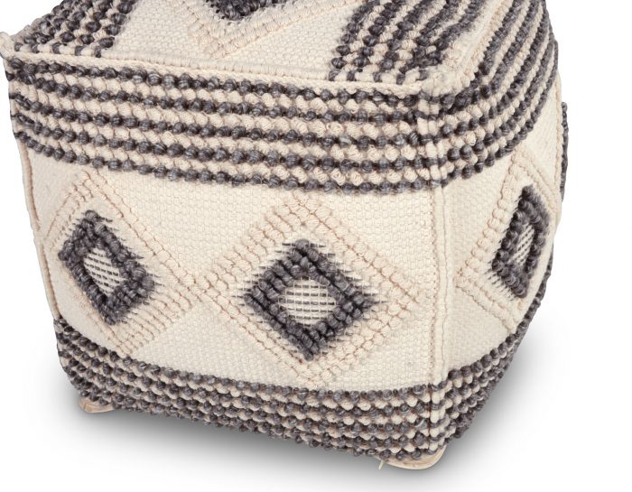 Kick up your feet with these handwoven pieces of fun! Poufs are great as a footrest, for extra seating or even to use as a pillow when laying on the floor. These stuffed, upholstered pieces are versatile and feature custom designs on each piece. The Dalia features an embroidered triangular pattern with contrasting borders on top and bottom. Comfortable and casual, Dalia softens a room while adding comfort and functionality to your style.