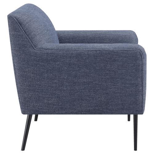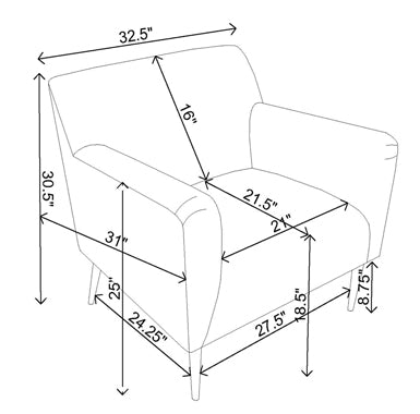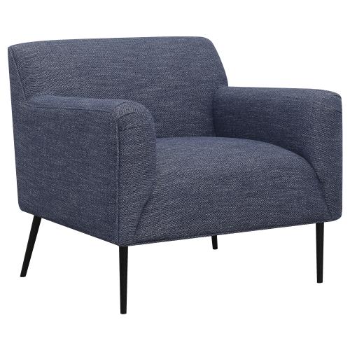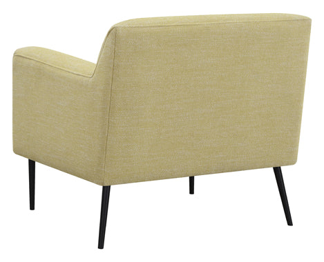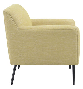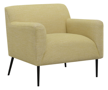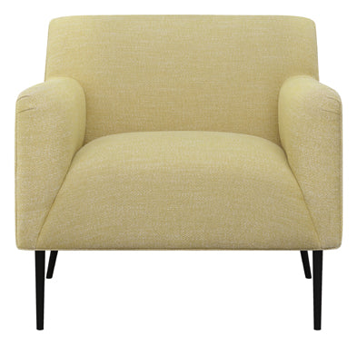 Upholstered in a beautiful, lemon polyester fabric, this contemporary accent chair is sure to catch the eye. The soft texture welcomes you to rest between soft track arms as you converse with friends or pick up a good book. Its cheerful, sunny disposition lends itself to vintage and coastal aesthetics effortlessly. Beneath, tapered black metal legs bring to mind mid-century modern vibes. Place this contemporary lemon accent chair in a bedroom or living room for a bold splash of color.