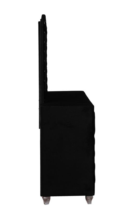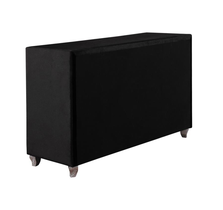 Add modern glamour to a young adult's bedroom with this seven-drawer black dresser. The ultimate luxury, soft velvet fabric adorns the sleek silhouette. Elevate the level of chic sophistication with radiant, curved legs in a metallic finish. Crystal drawer pulls and lines of crystal button diamond tufting adorn the drawers. Top with a mirrored vase full of fresh flowers or the latest magazines to complete the stylish look.
