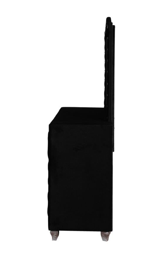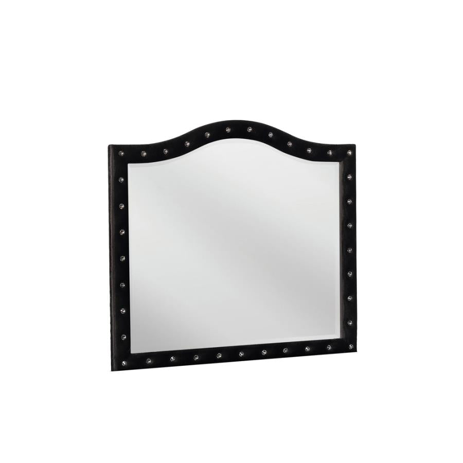 Transform a sophisticated space with this stunning large black mirror. The traditional silhouette gets a modern upgrade with soft velvet fabric. Luxurious and shiny, the crystal button tufted trim radiates chic light throughout a bedroom. With angled corners and a slight bell curve, this sleek mirror looks great above a dresser. Apply makeup or do your hair in the richly elevated reflection.
