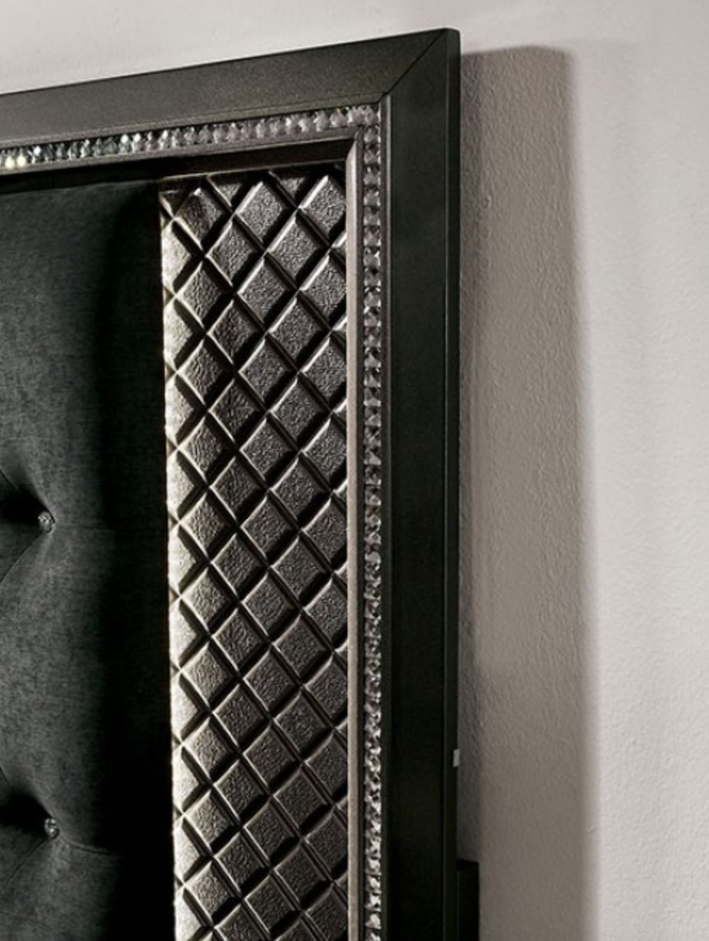 Give your house a high roller suite with this ravishing bed. Every single inch of this ensemble holds something for you to enjoy, all the way down to the silver toe carved bun feet. Pebble boxed paneling canvases the collection's drawer faces and headboard side paneling. This unmistakable paneling is accented by beveled mirror trimming and acrylic encrusted drawer handles. The play on shape and texture is not lost on the headboard's button tufted fabric mantle, raised just above the pebbling and back lit by LEDs.
