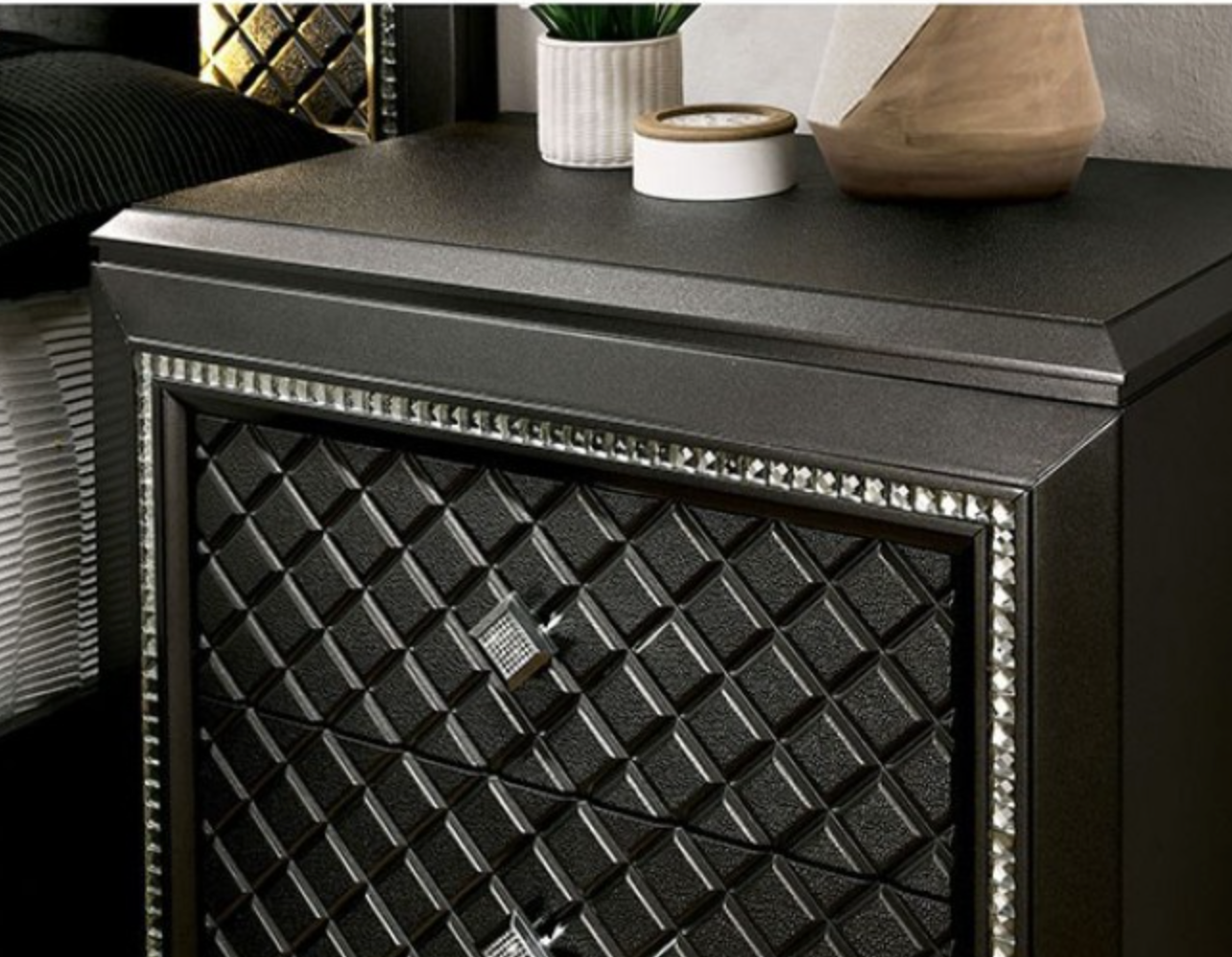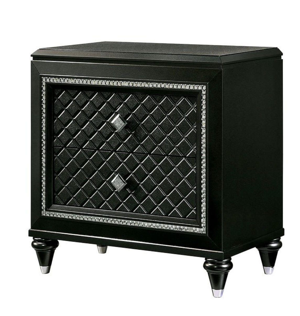 Give your house a high roller suite with this ravishing night stand. Every single inch of this piece holds something for you to enjoy, all the way down to the silver toe carved bun feet. Pebble boxed paneling canvases the drawer faces. This unmistakable paneling is accented by beveled mirror trimming and acrylic encrusted drawer handles.