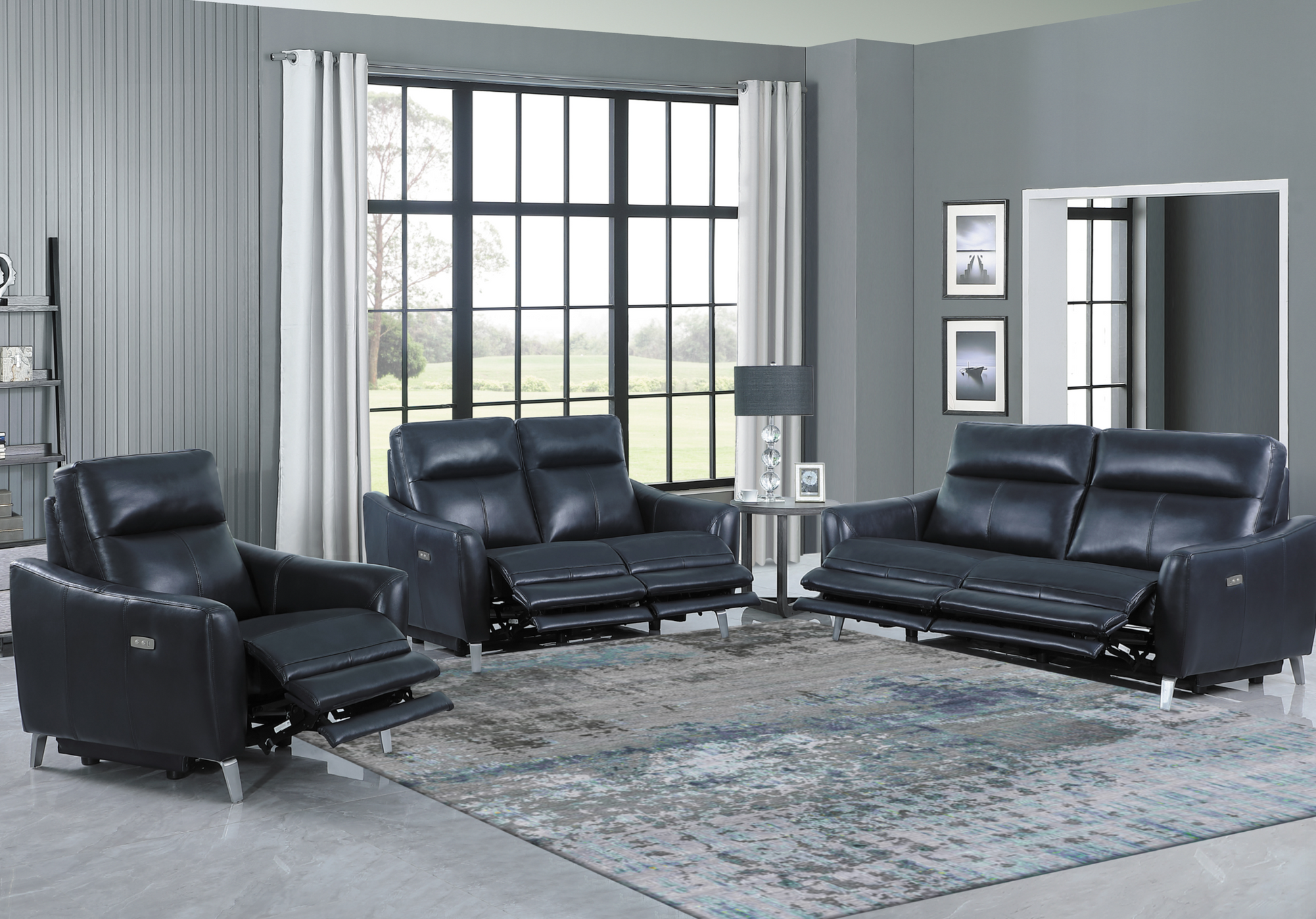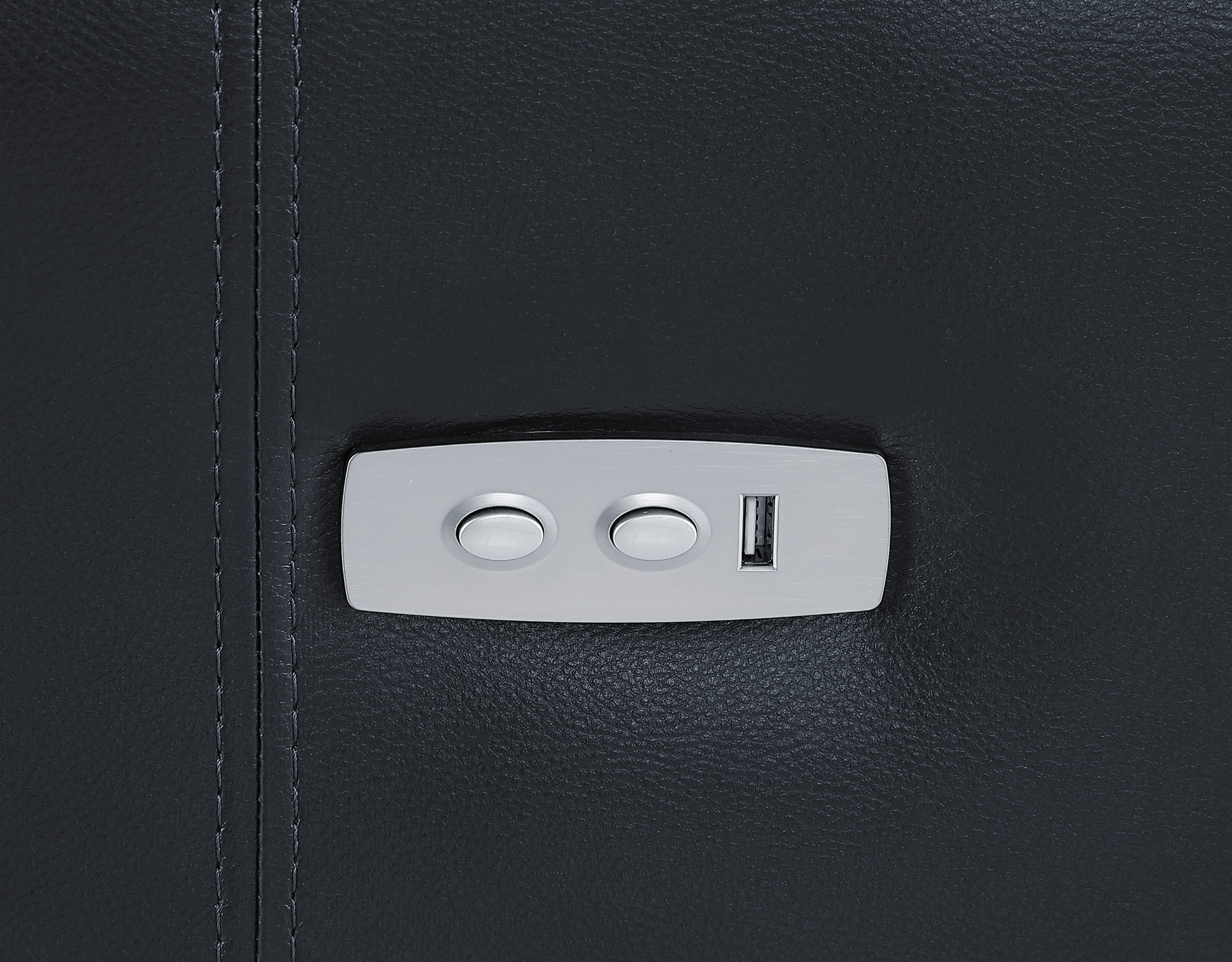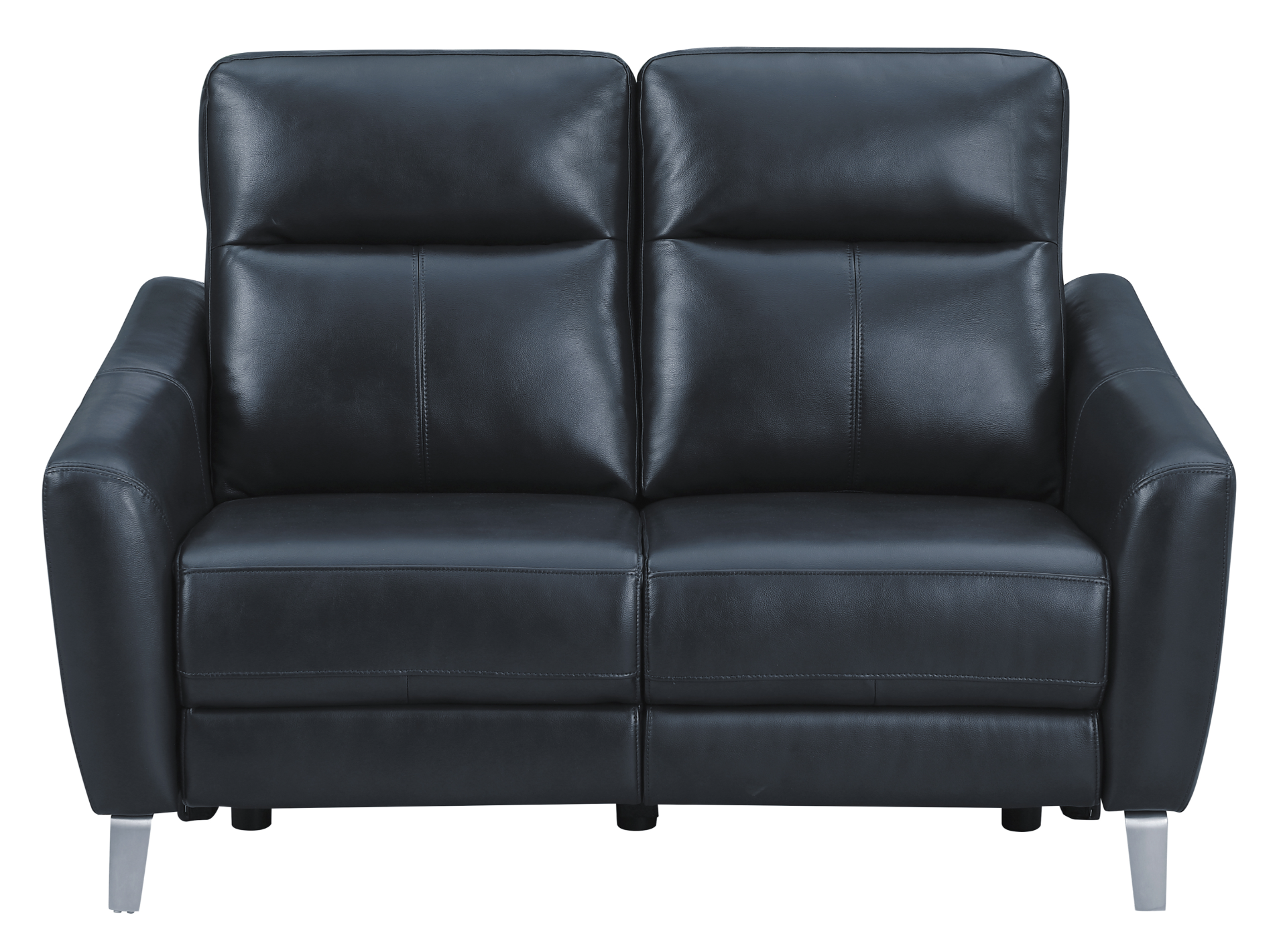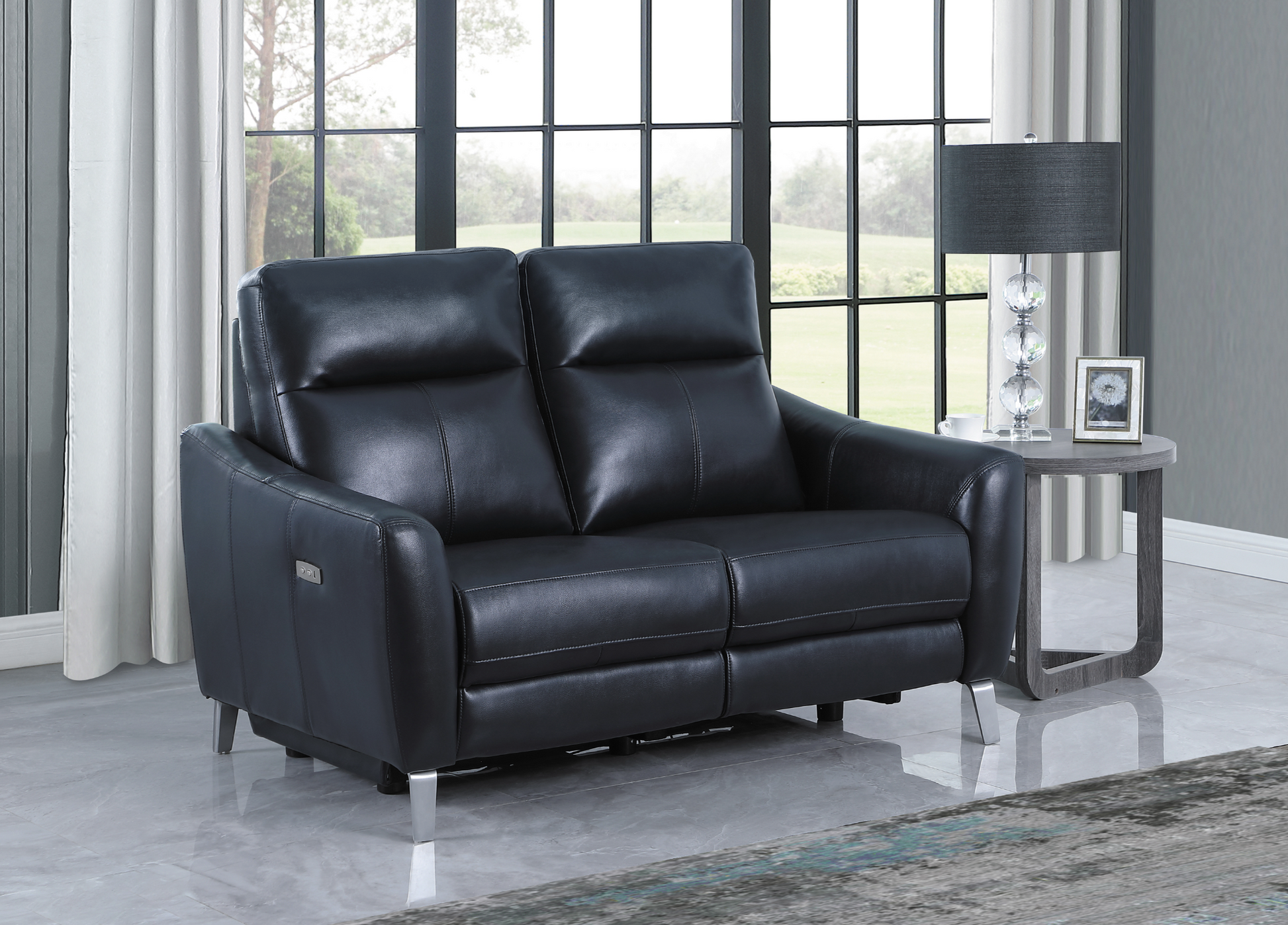 Assume the position in a modern space with this elegant power reclining loveseat, wrapped in chic dark blue leatherette upholstery. Smaller spaces are perfect for this compact loveseat, embellished with extra-long footrests to accommodate extra-long bodies. Take advantage of pleasing temperature control with cool gel memory foam over solid construction materials, and charge electronic devices with a handy built-in USB port. The recliner includes a wall hugger mechanism, saving precious floor space in your family room. With power recline functionality, this loveseat is simple and easy for the whole family to operate.Includes: