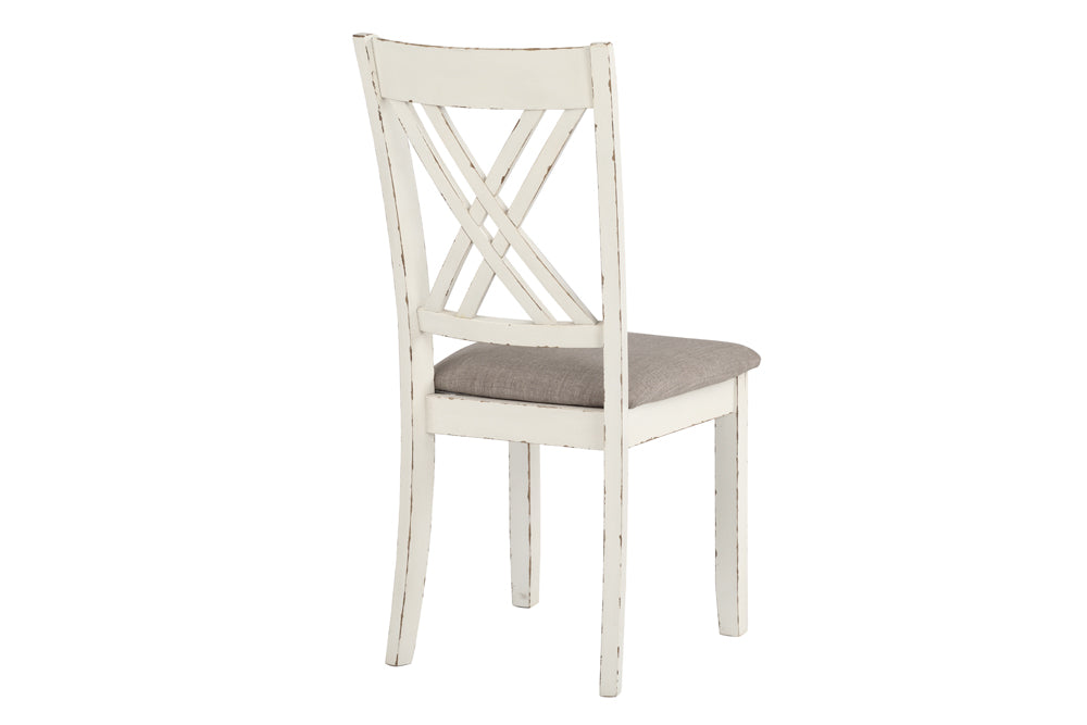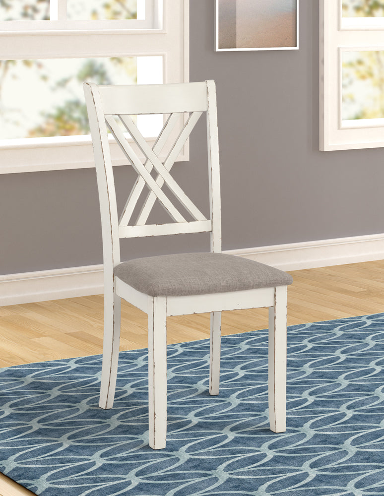 Complete your modern farmhouse dining room with this seven-piece dining set. Complete with one dining table and six side chairs, it offers a matching vintage white finish that lends a country charm. The spacious, rectangular dining table also features a chestnut colored, sandblasted wood tabletop with a dry brushed weathered finish. Each of the six chairs have a sturdy solid wood frame and flared backrests with open double-cross designs. Rest comfortably on their cushioned seats, wrapped in a high performance fabric in a grey hue that complements numerous color palettes.
