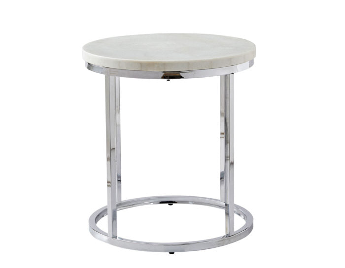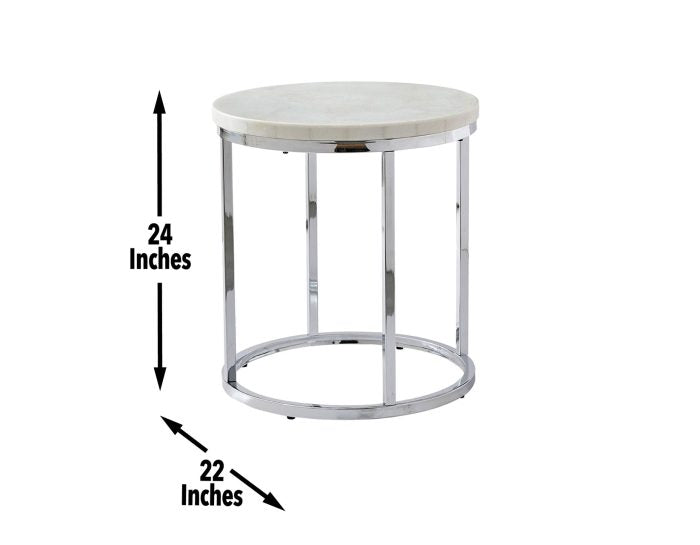 - Styling details include soft round shapes with white marble tops and chrome bases give tables a soft contemporary feel that will add sparkle to any room