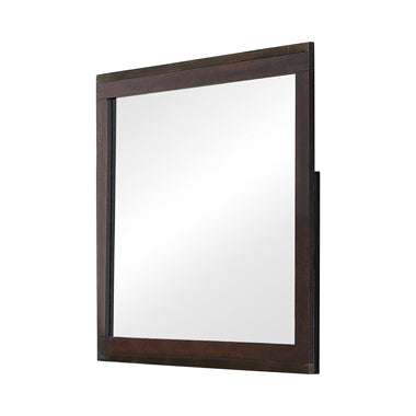 This sophisticated five-piece bedroom set creates a cool, classy aesthetic in any modern home. Its stylish design combines rustic wood with metal accents for a bold, mixed-media look. Clean, straight lines give each piece a pleasingly crisp silhouette. Beautiful shades of tobacco and bronze complete its stunning appearance. Complete with a bed, dresser, mirror, nightstand, and chest, this versatile set is endlessly appealing.