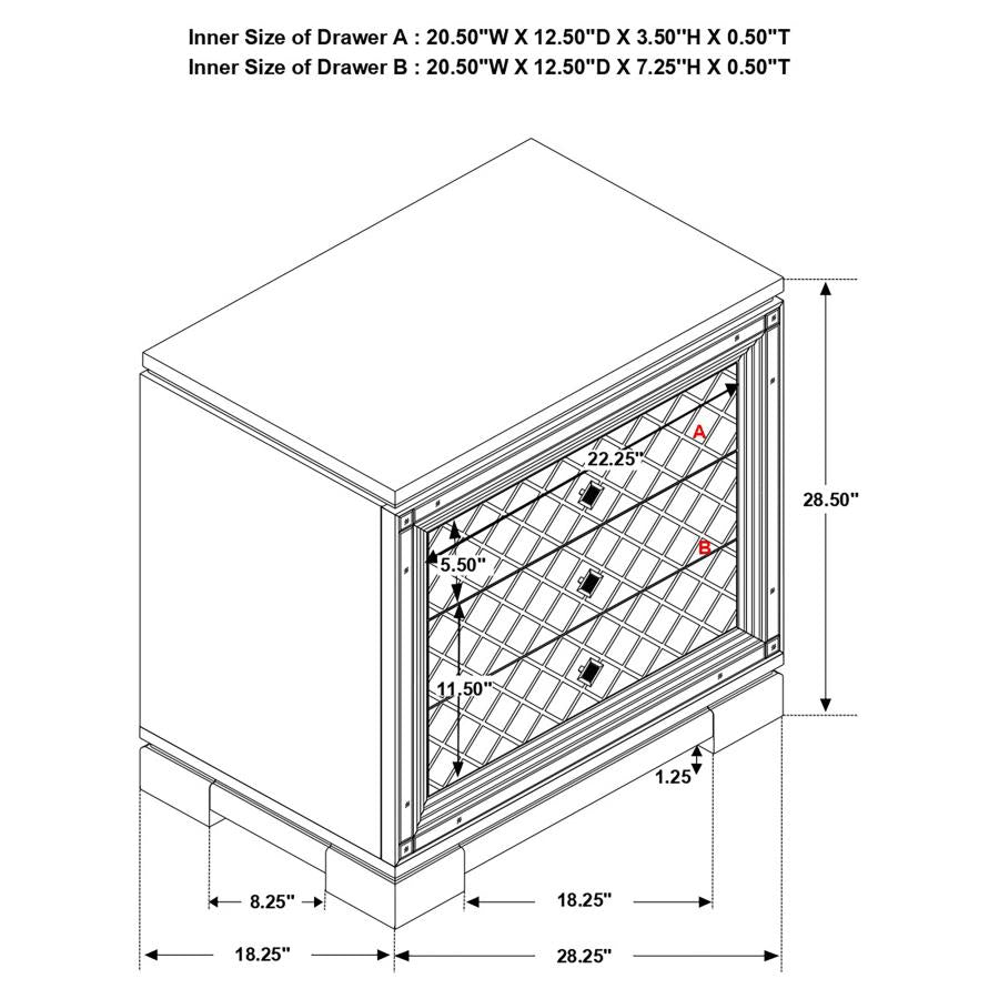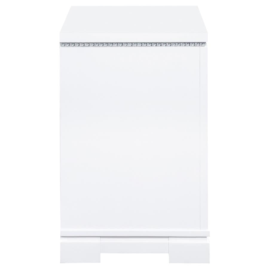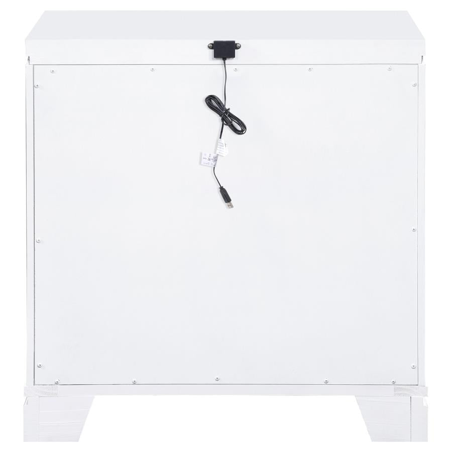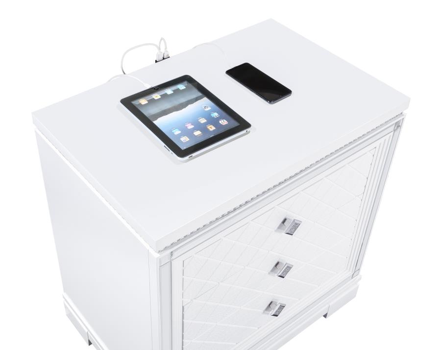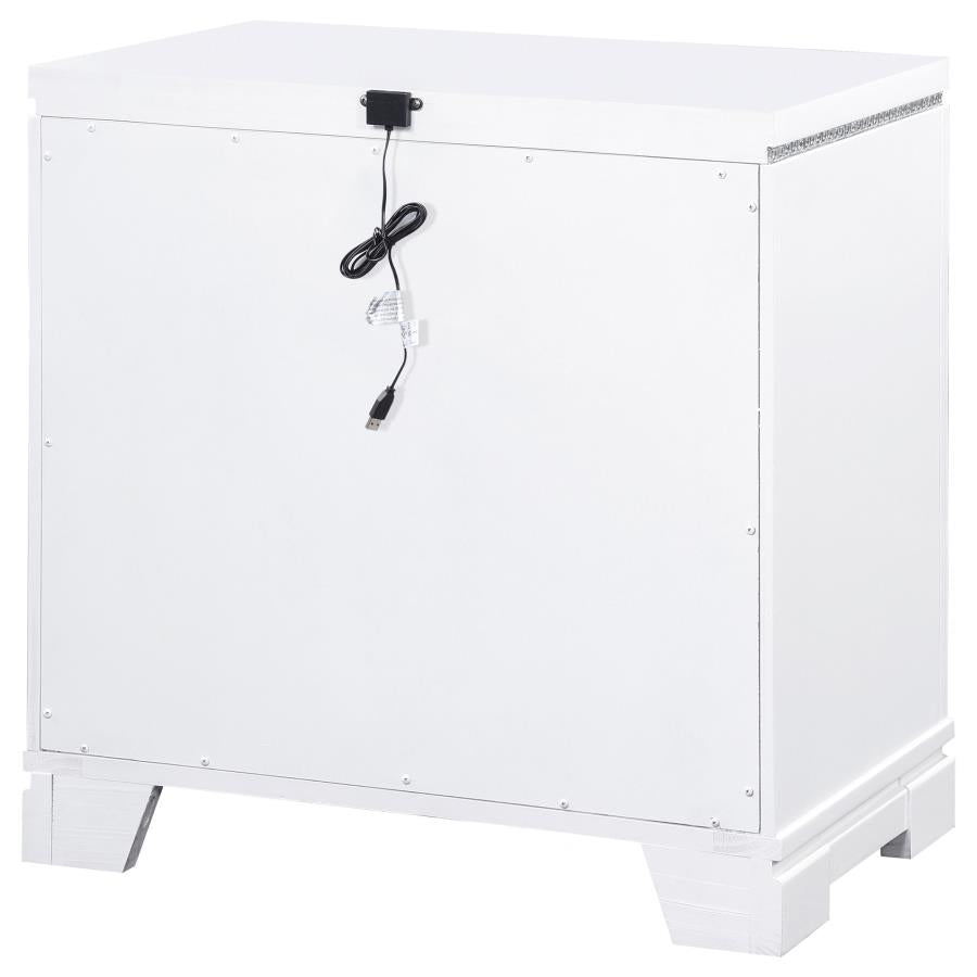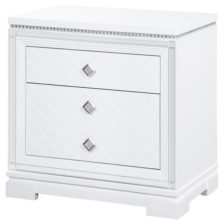 Clean lines and luxe details shine through in this two-drawer nightstand from the Eleanor bedroom set. Sparkling accents like a reflective mirror trim outlining the set of drawers and square knobs encrusted with diamond-like accents create a regal display against a bed. This glam nightstand opens itself up to whatever color palette you prefer and offers hidden extras like USB charging ports and a felt-lined top drawer for delicate accessories and jewelry. Lending to the understated white finish is textured drawer fronts embossed in a wild crocodile and diamond pattern. Along the top just below the tabletop surface is a slim crystal-like molding that completes the piece and mirrors the hardware.