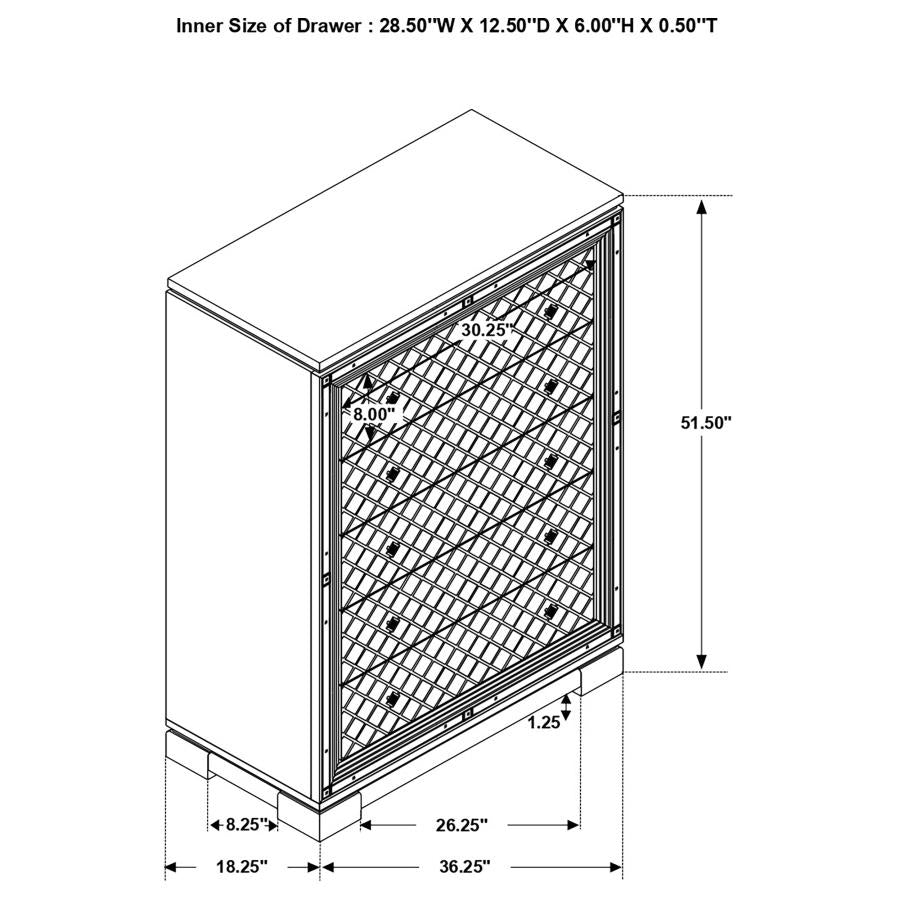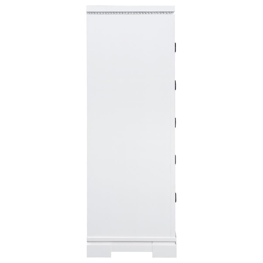 - Features mirror trim accents, grid-patterned front panels in a glowing white finish