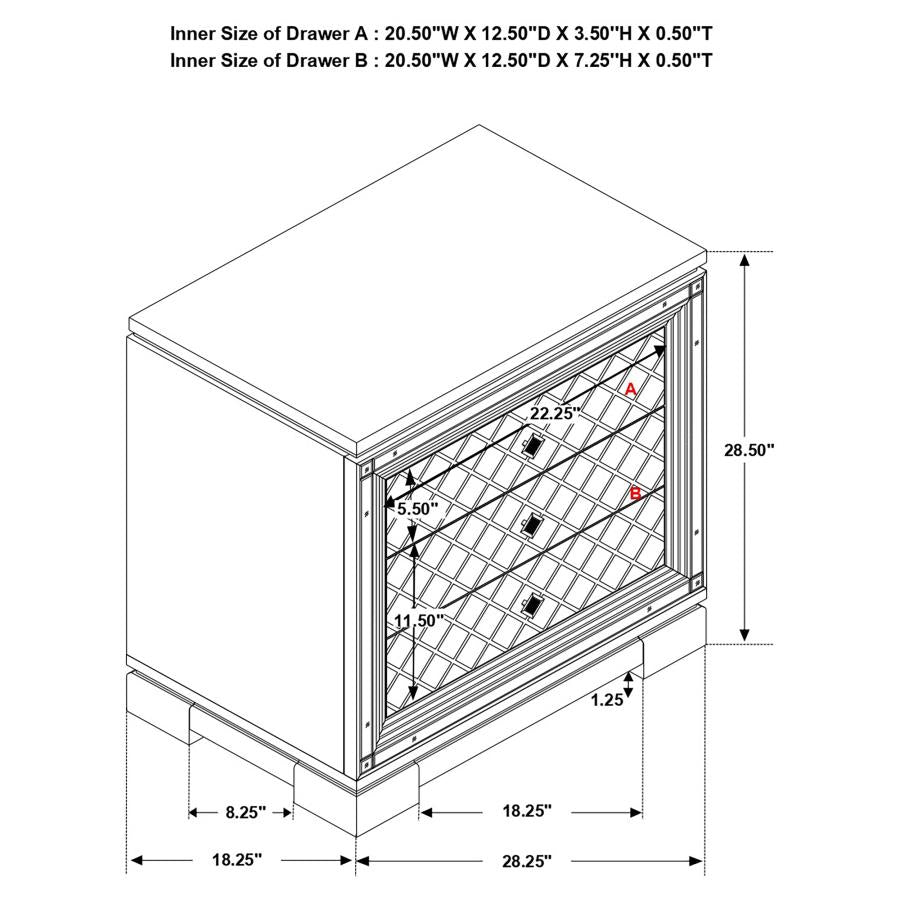 Understated elegance and luxe accents combine to create this glam five-piece bedroom set. Topped off with inlaid mirror trim tile borders, matched by sparkling acrylic buttons in a silver velvet padded headrest, each bedroom essential makes a stunning display for a restful retreat. Upon a closer look at the bright finish, subtle embossed patterns emerge, revealing a dual diamond and crocodile print across the footboard and drawer panels. Set atop the dresser is a wide framed mirror adorned with 15 exposed bulbs to offer a well-rounded glow for applying cosmetics and styling hair. Glamorous bedroom set also provides modern sensibilities like USB power outlets and soft felt-lined top drawers for delicate wardrobe pieces and jewelry.