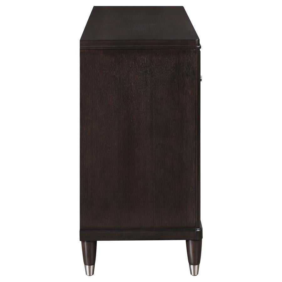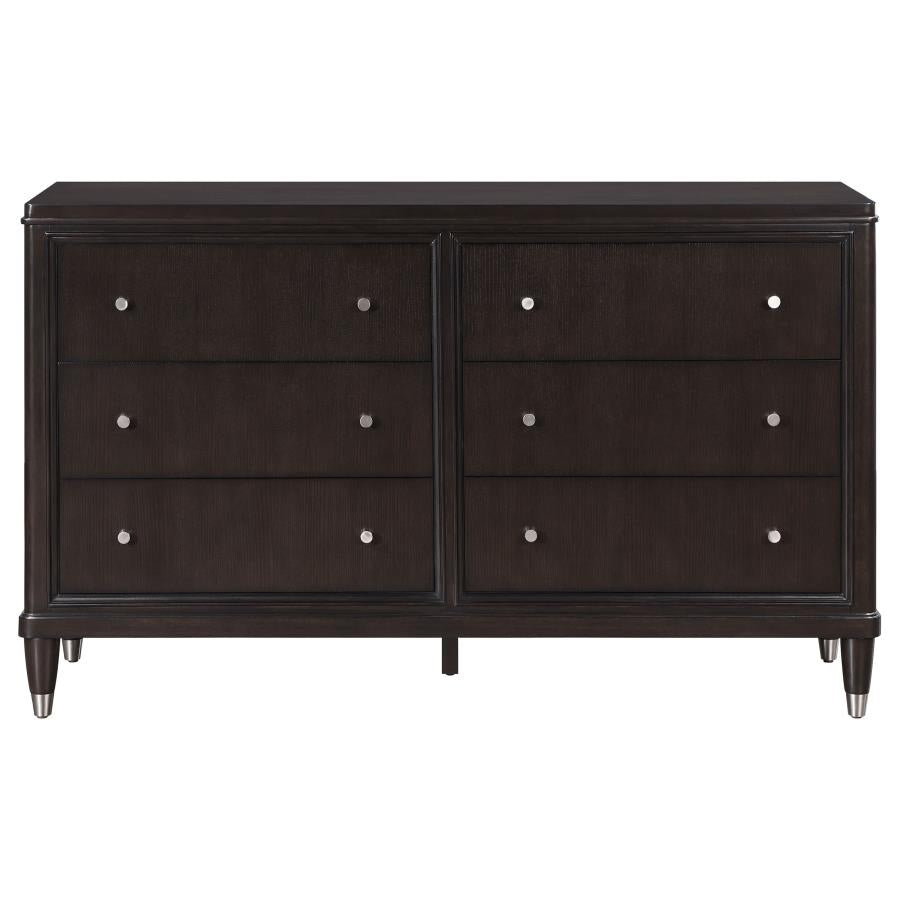 Introduce stylish storage in your bedroom with a modern six-drawer dresser. Its sleek look is accentuated in a dark brown finish, with metallic accents that add depth to tapering feel. Petite knobs decorate each drawer front as drawers offer ample storage for clothing, linens and accessories in your bedroom. The dresser offers a wide top for decor and drawers add protection with felt lining in top drawer and cedar lining and bottom drawers. Add framed photos or a metal sculptural piece to the top of the dresser to add a personal touch.