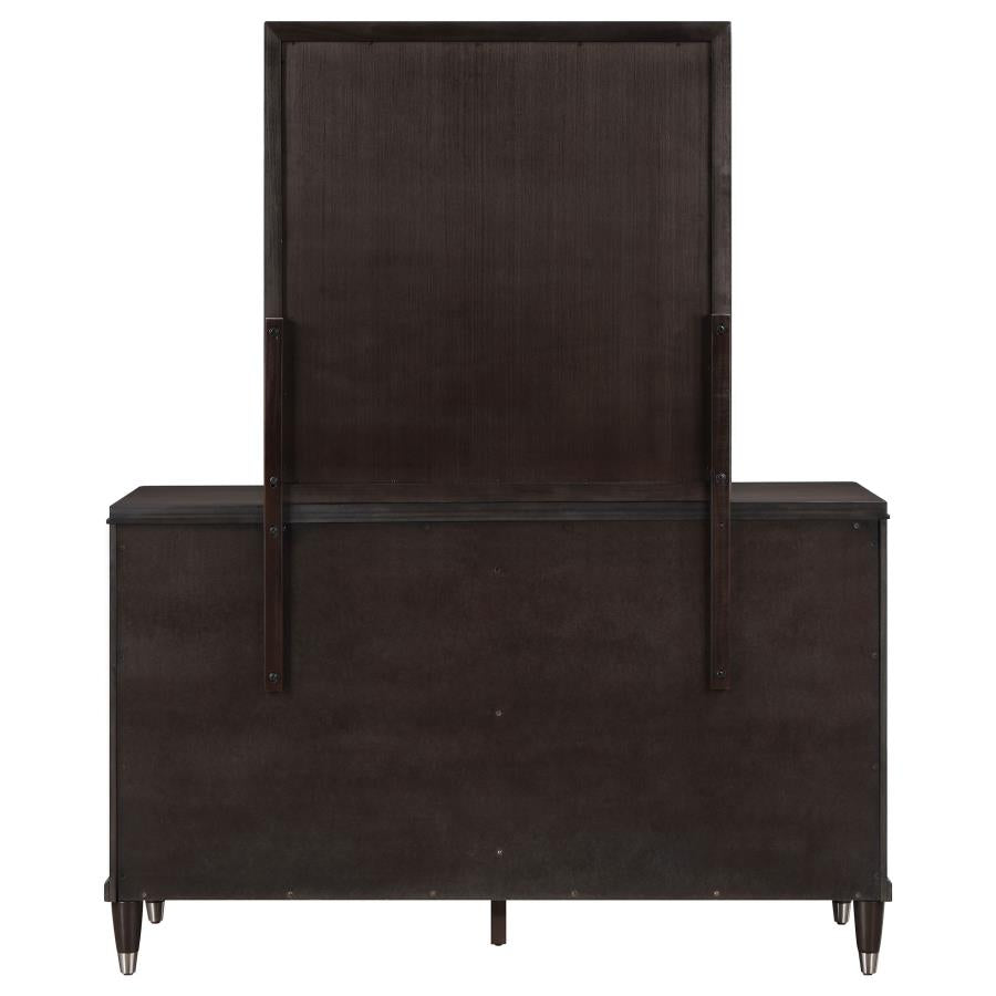 Bring stylish flair and plentiful storage to your bedroom with a modern six-drawer dresser and mirror. It showcases a dark brown wood finish, paired with silver-toned round knobs and ferrules on its legs that add gleaming contrast and depth. Six drawers provide ample storage and organization for clothing and accessories, with a red-brown velvet lined jewelry tray included that's ideal for protecting pieces you wear regularly. The mirror on top of the dresser creates a vanity like space, and is framed for a finished look and feel. This stylish dresser is the perfect addition to your existing bedroom ensemble.